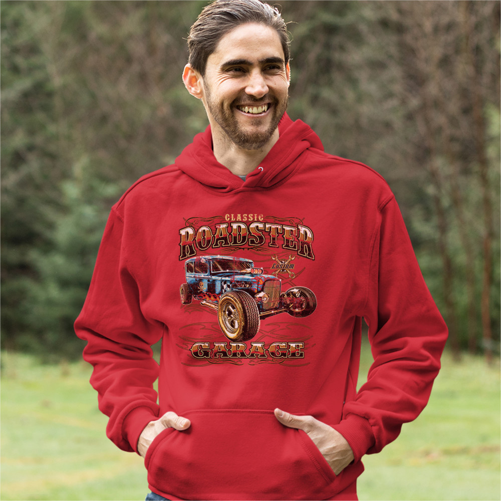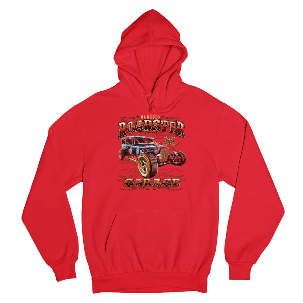 A print featuring a vintage-looking rat rod with flames and a skull with crossbones painted on it's side. "Classic Roadster" is written in the top and "Garage" in the bottom of the print. In the background there is a sign with crossed wrenches which says "custom". Great for Route 66 and hot rod fans.