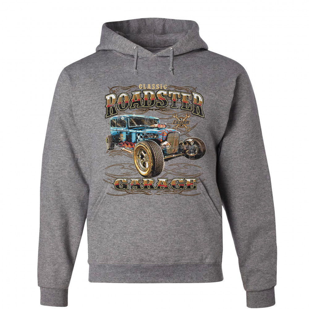 A print featuring a vintage-looking rat rod with flames and a skull with crossbones painted on it's side. "Classic Roadster" is written in the top and "Garage" in the bottom of the print. In the background there is a sign with crossed wrenches which says "custom". Great for Route 66 and hot rod fans.