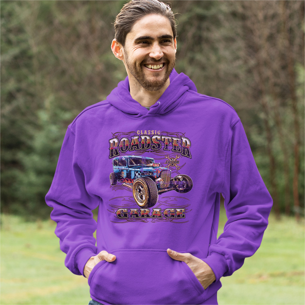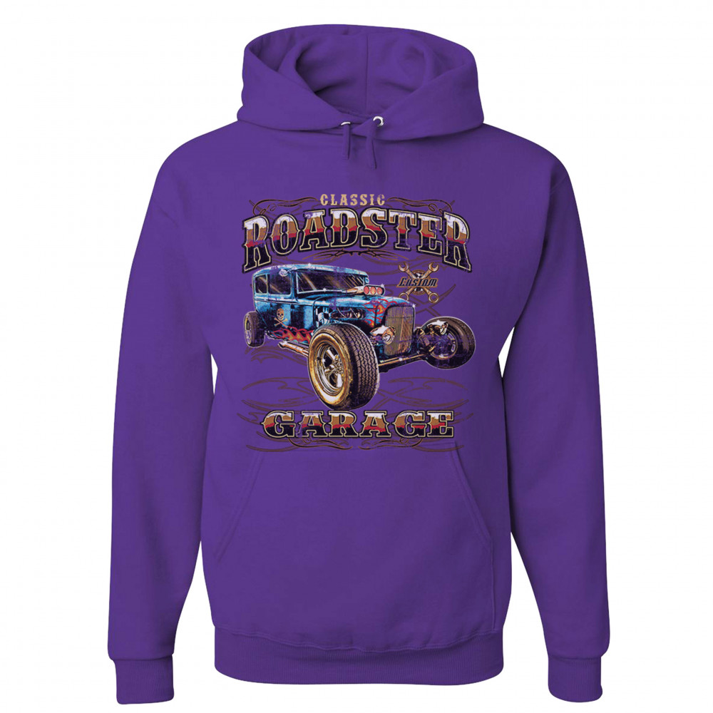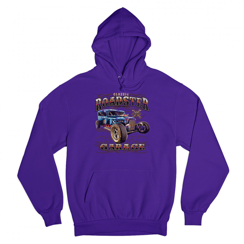 A print featuring a vintage-looking rat rod with flames and a skull with crossbones painted on it's side. "Classic Roadster" is written in the top and "Garage" in the bottom of the print. In the background there is a sign with crossed wrenches which says "custom". Great for Route 66 and hot rod fans.