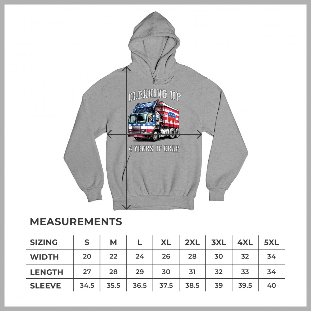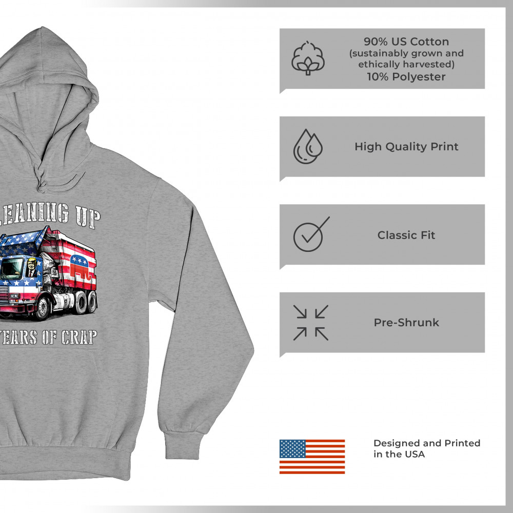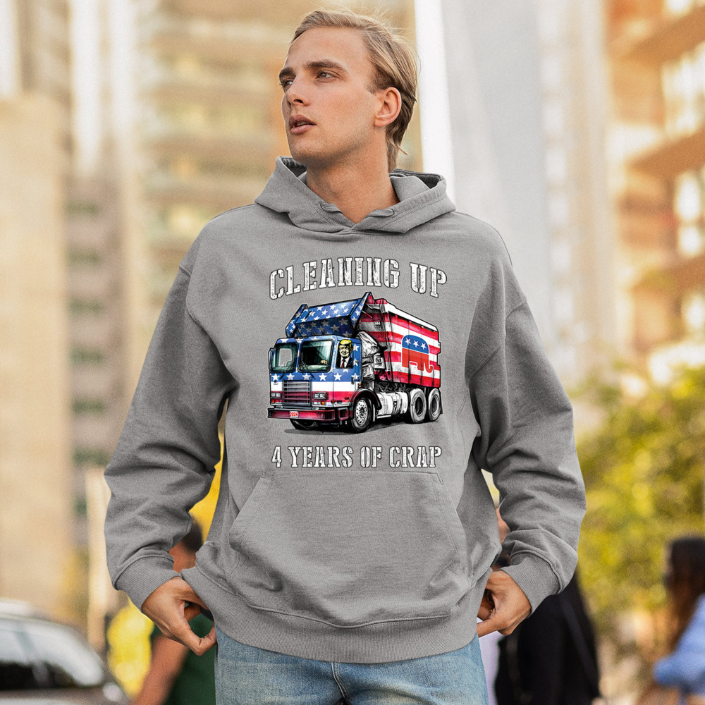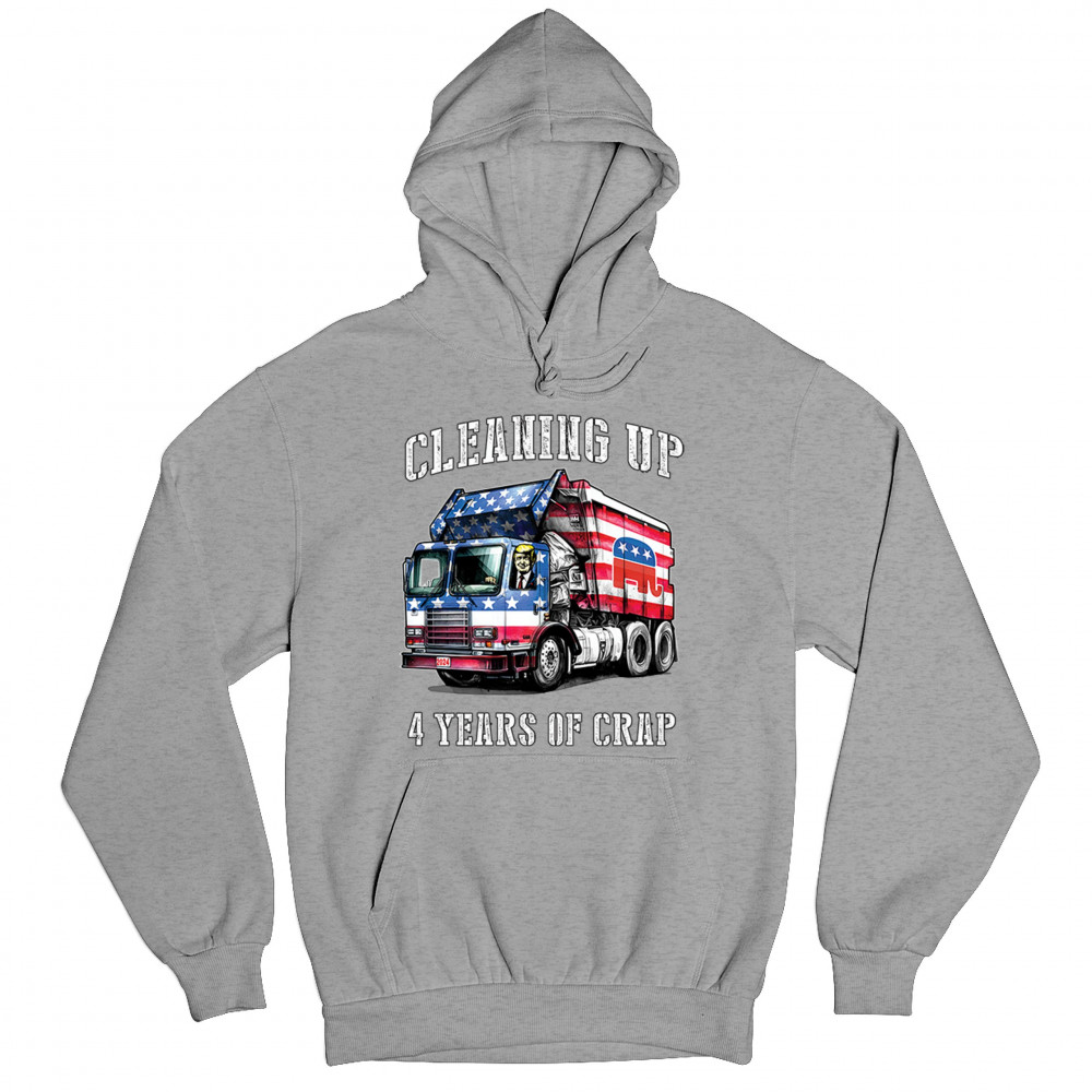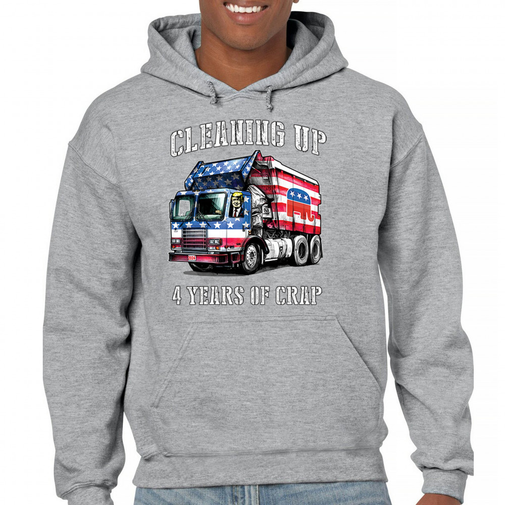 Bold "Cleaning Up 4 Years of Crap" design featuring Trump, the GOP, and the American flag. Perfect for proud conservatives and patriots.