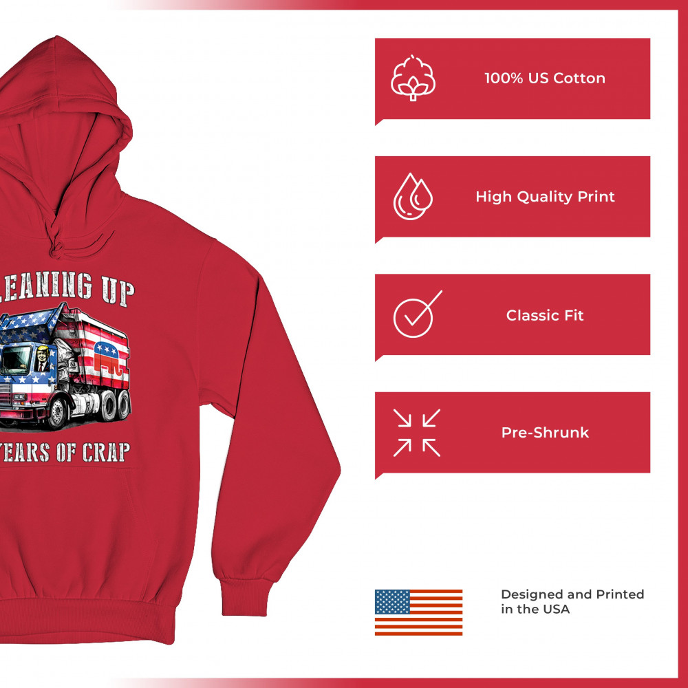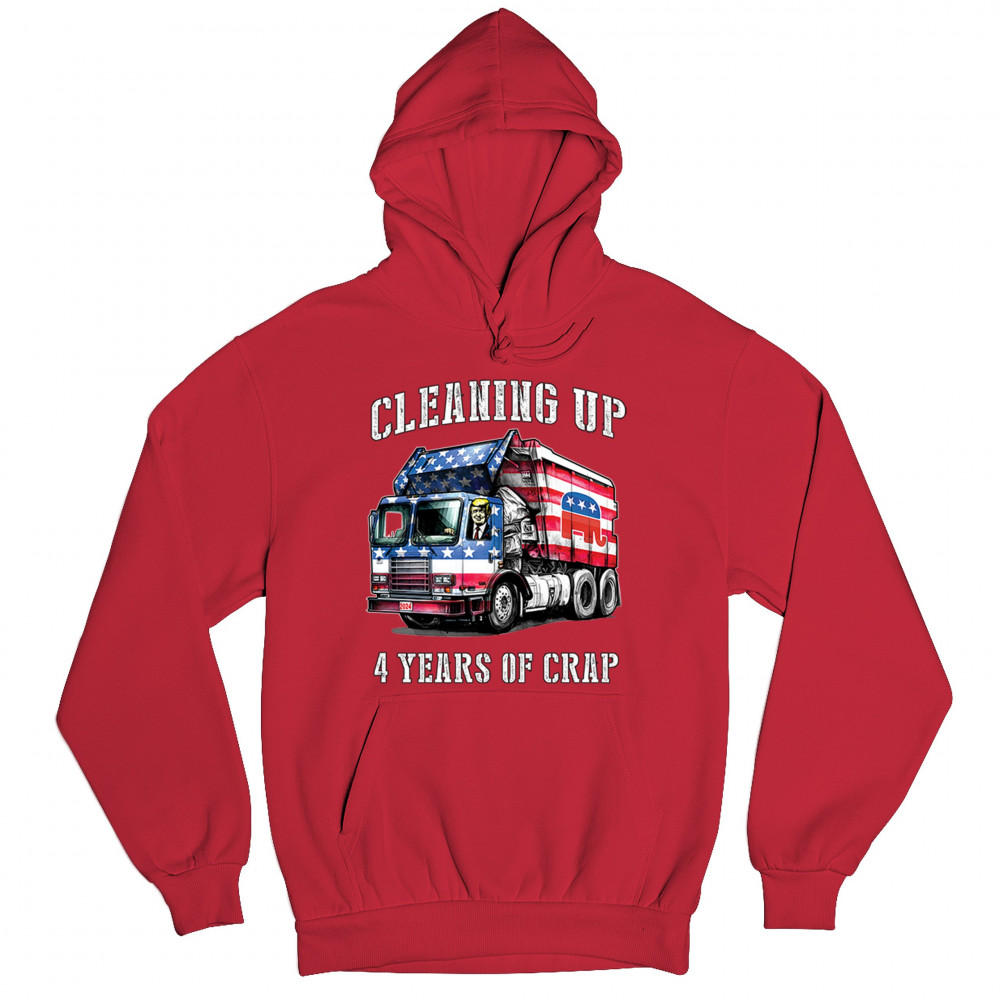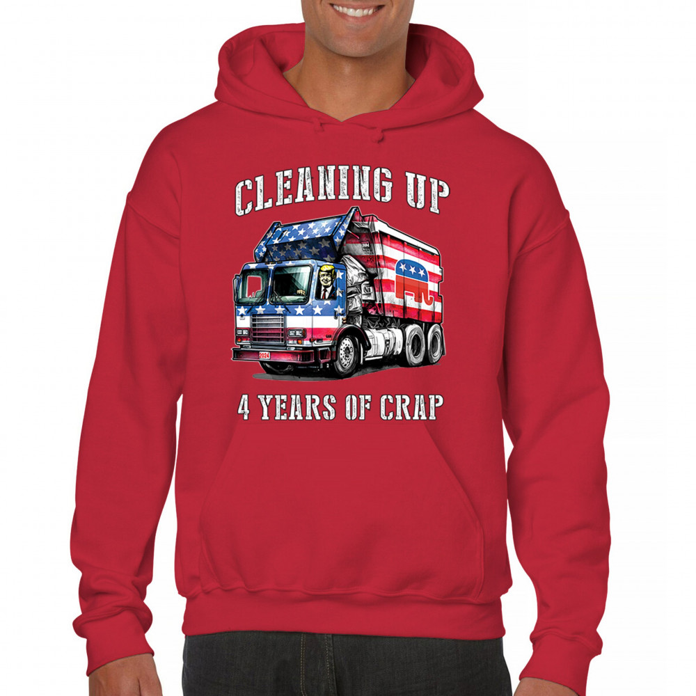 Bold "Cleaning Up 4 Years of Crap" design featuring Trump, the GOP, and the American flag. Perfect for proud conservatives and patriots.
