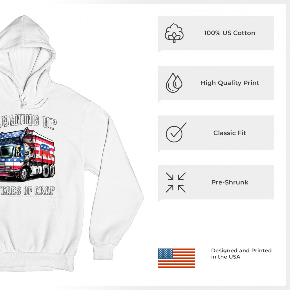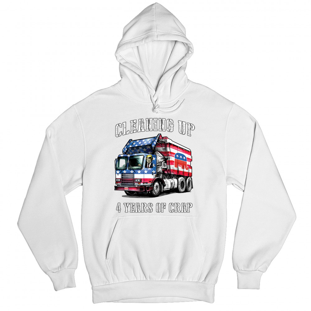 Bold "Cleaning Up 4 Years of Crap" design featuring Trump, the GOP, and the American flag. Perfect for proud conservatives and patriots.