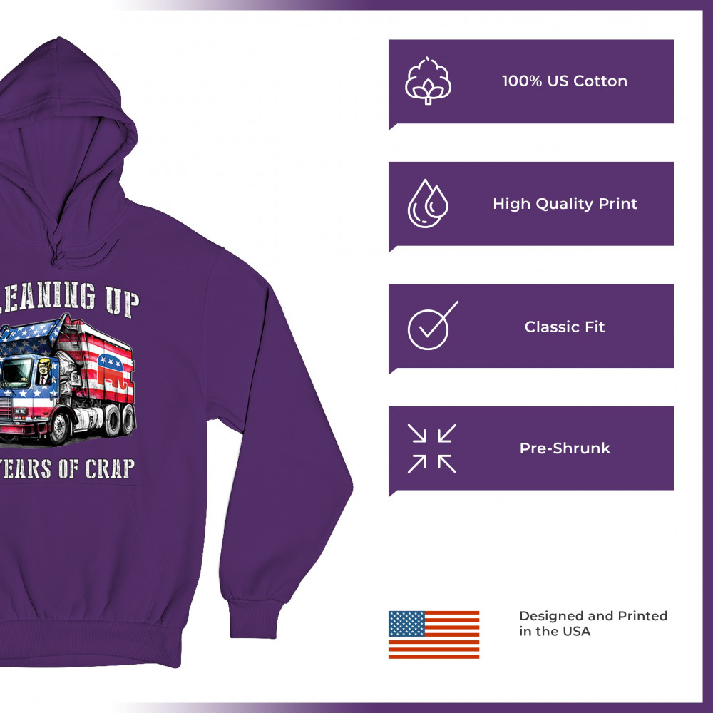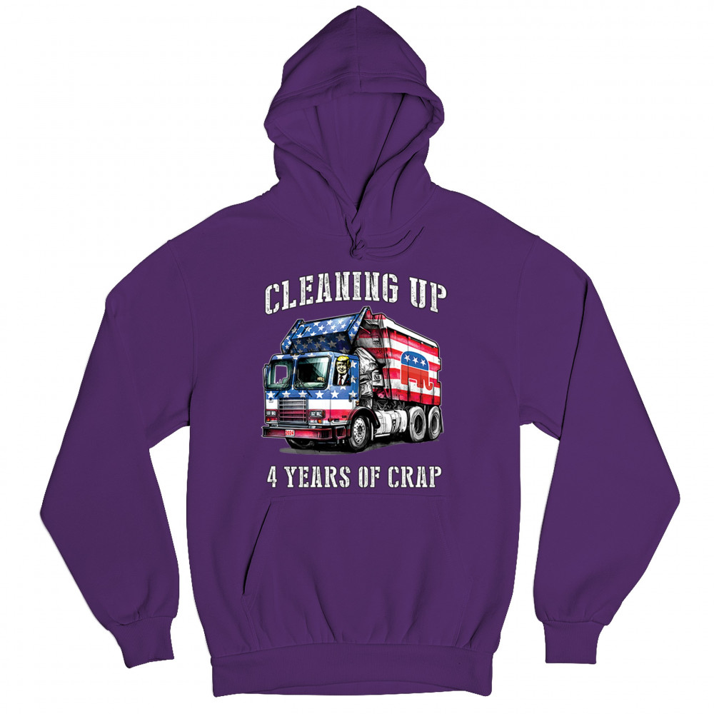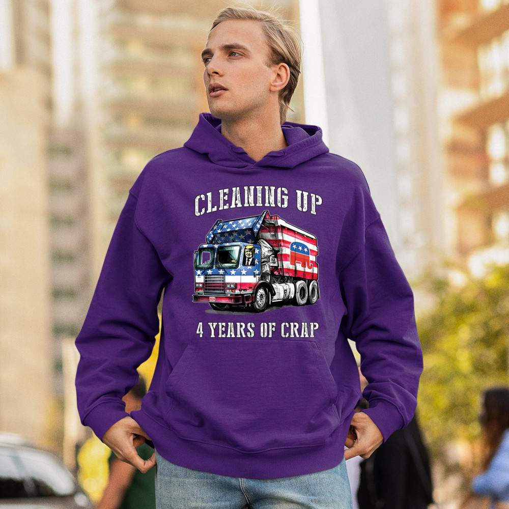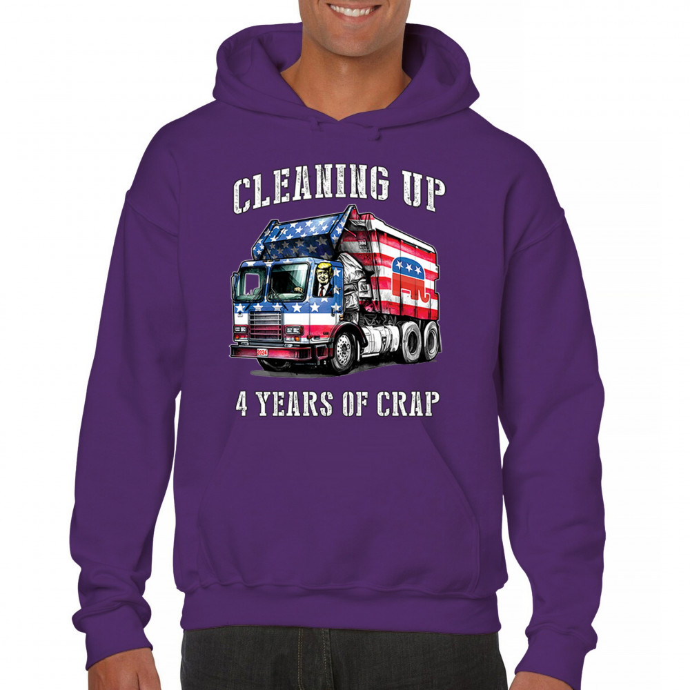Bold "Cleaning Up 4 Years of Crap" design featuring Trump, the GOP, and the American flag. Perfect for proud conservatives and patriots.