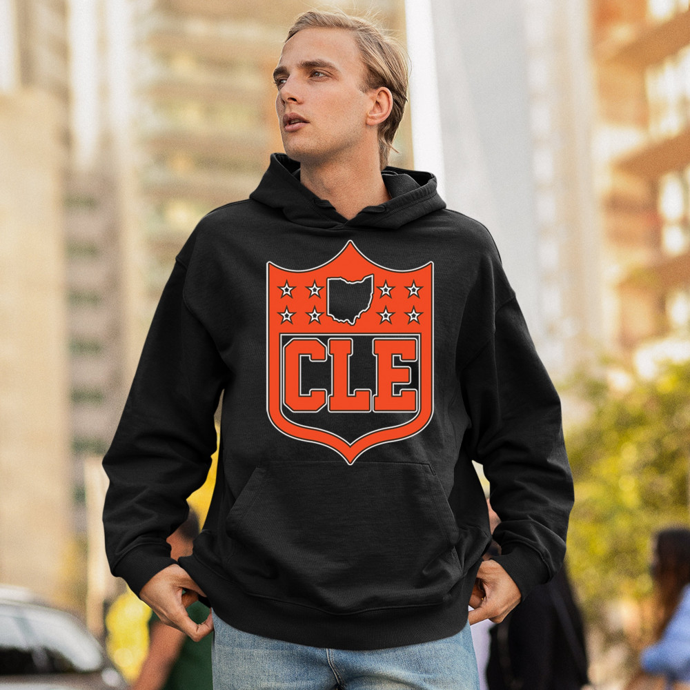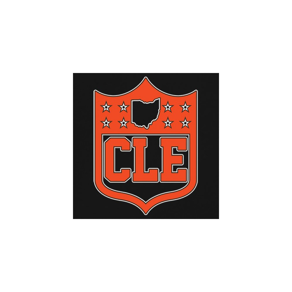 Bold CLE shield design honoring Cleveland football nation with Rust Belt pride, underdog grit, and blue collar sports heritage.