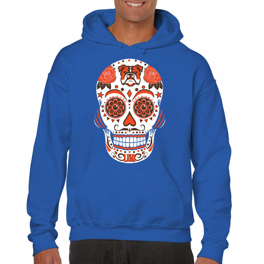 Cleveland Sugar Skull with Lake Erie pride, Rust Belt football grit, orange & brown tradition, playoff vibes, and Game Day passion.