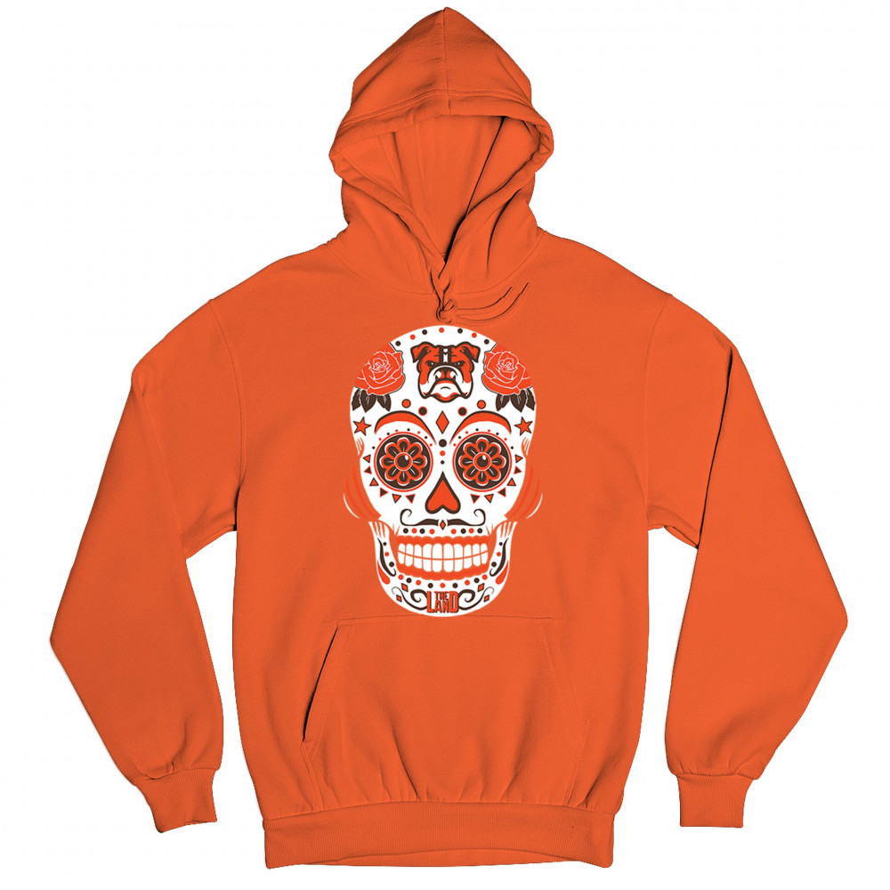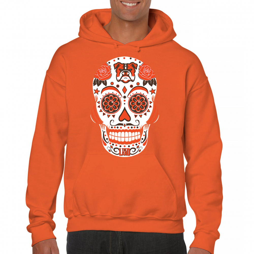 Cleveland Sugar Skull with Lake Erie pride, Rust Belt football grit, orange & brown tradition, playoff vibes, and Game Day passion.