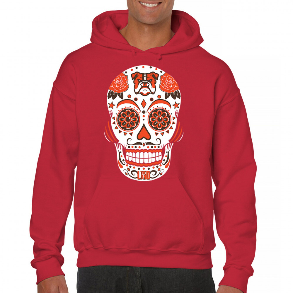 Cleveland Sugar Skull with Lake Erie pride, Rust Belt football grit, orange & brown tradition, playoff vibes, and Game Day passion.