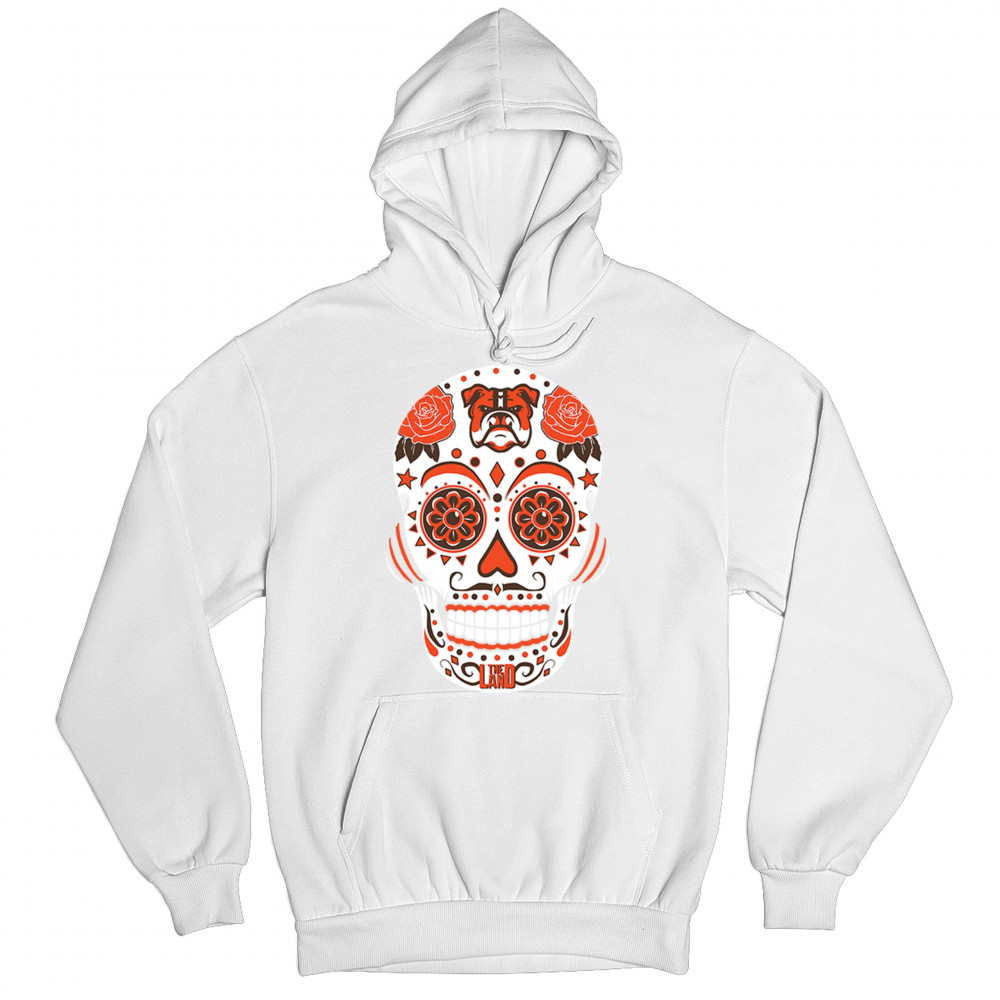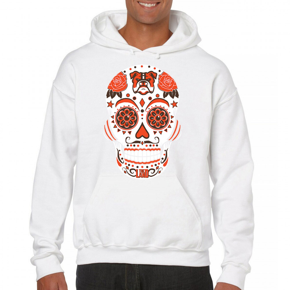Cleveland Sugar Skull with Lake Erie pride, Rust Belt football grit, orange & brown tradition, playoff vibes, and Game Day passion.