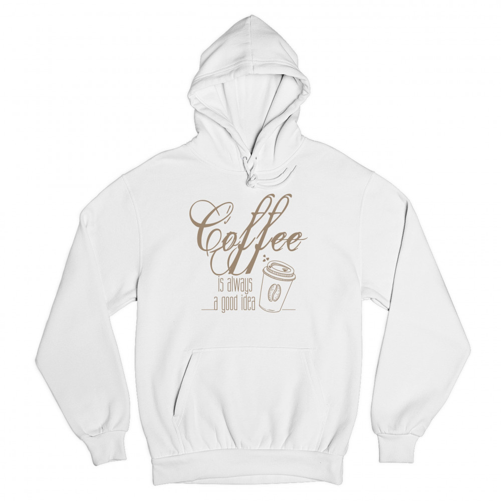 A print saying "Coffee is always a good idea". The print features a picture of a paper cup of tea with a coffee bean on it and with several hearts steaming from it. A great choice to wear to spread positive vibes and show what a passionate coffee fan you