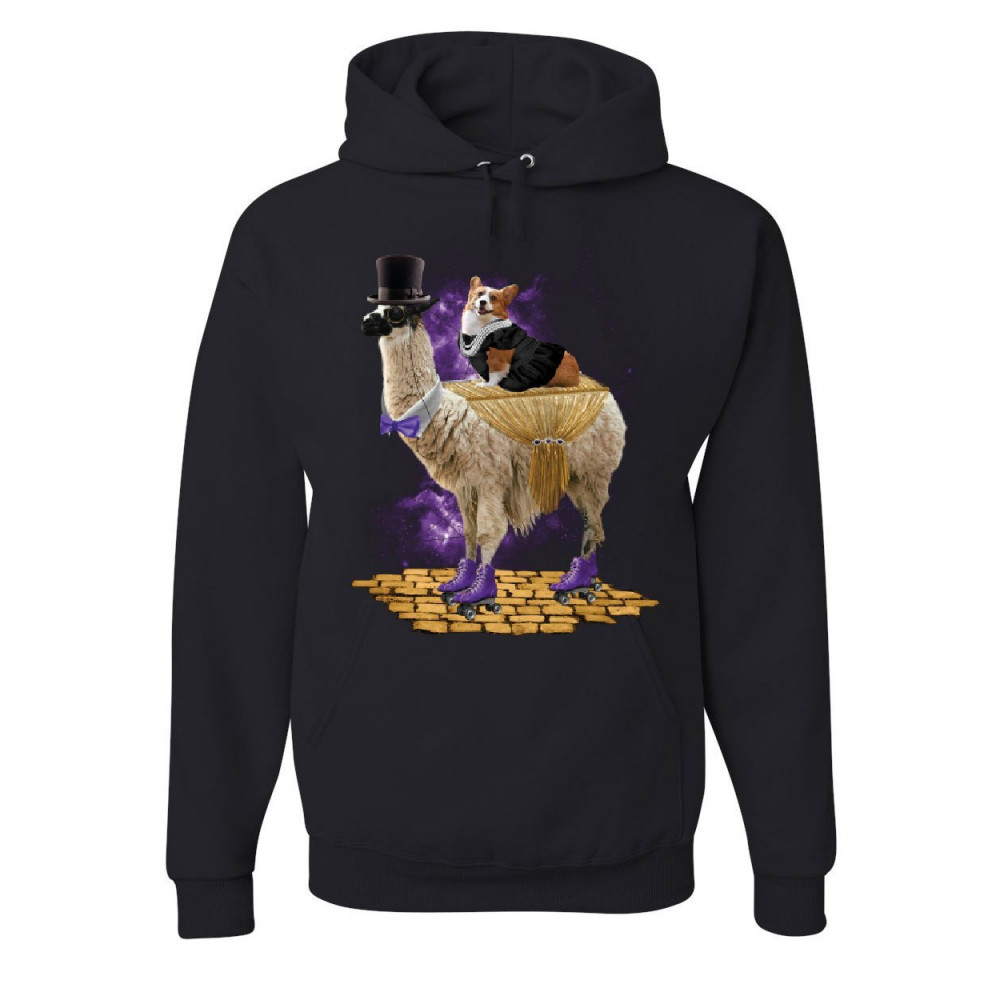 CORGI RIDING A LLAMA corgi riding a gentleman llama hoodie funny weird universe dog sweatshirt black