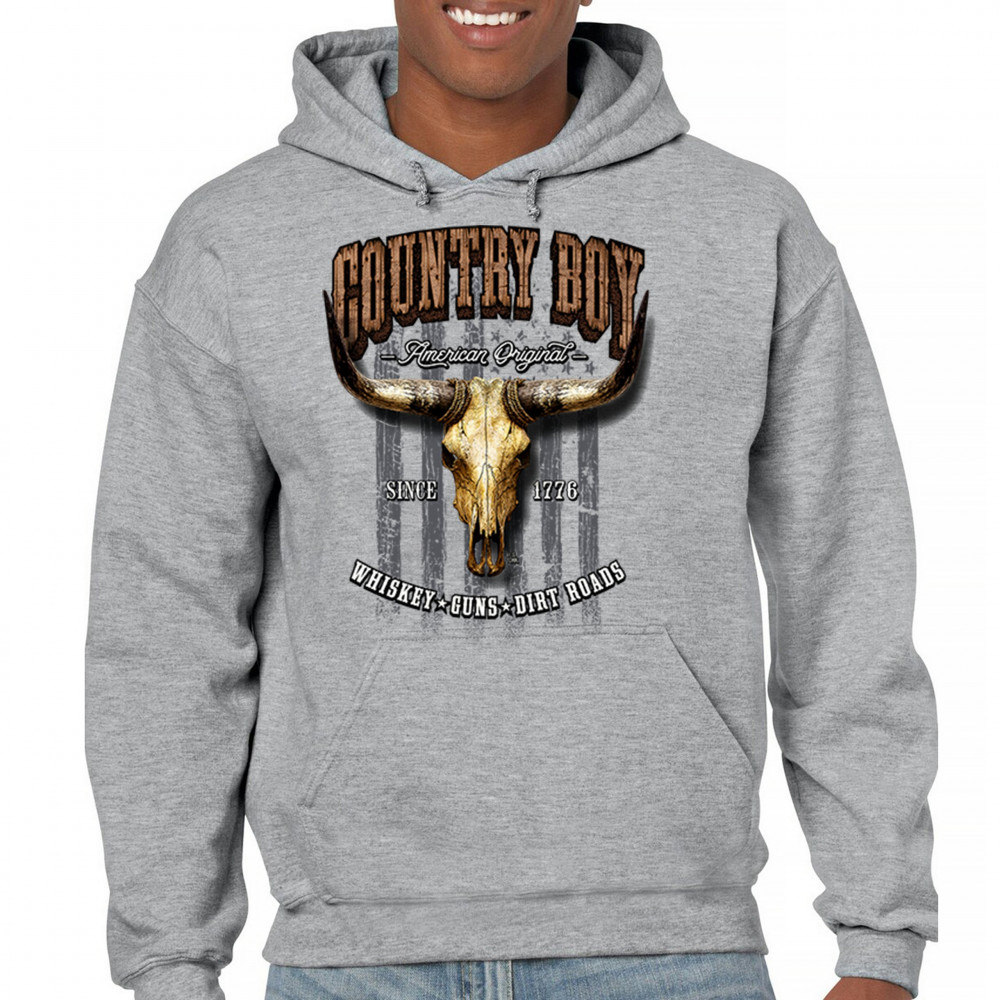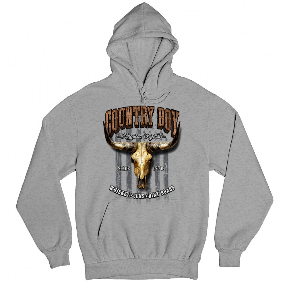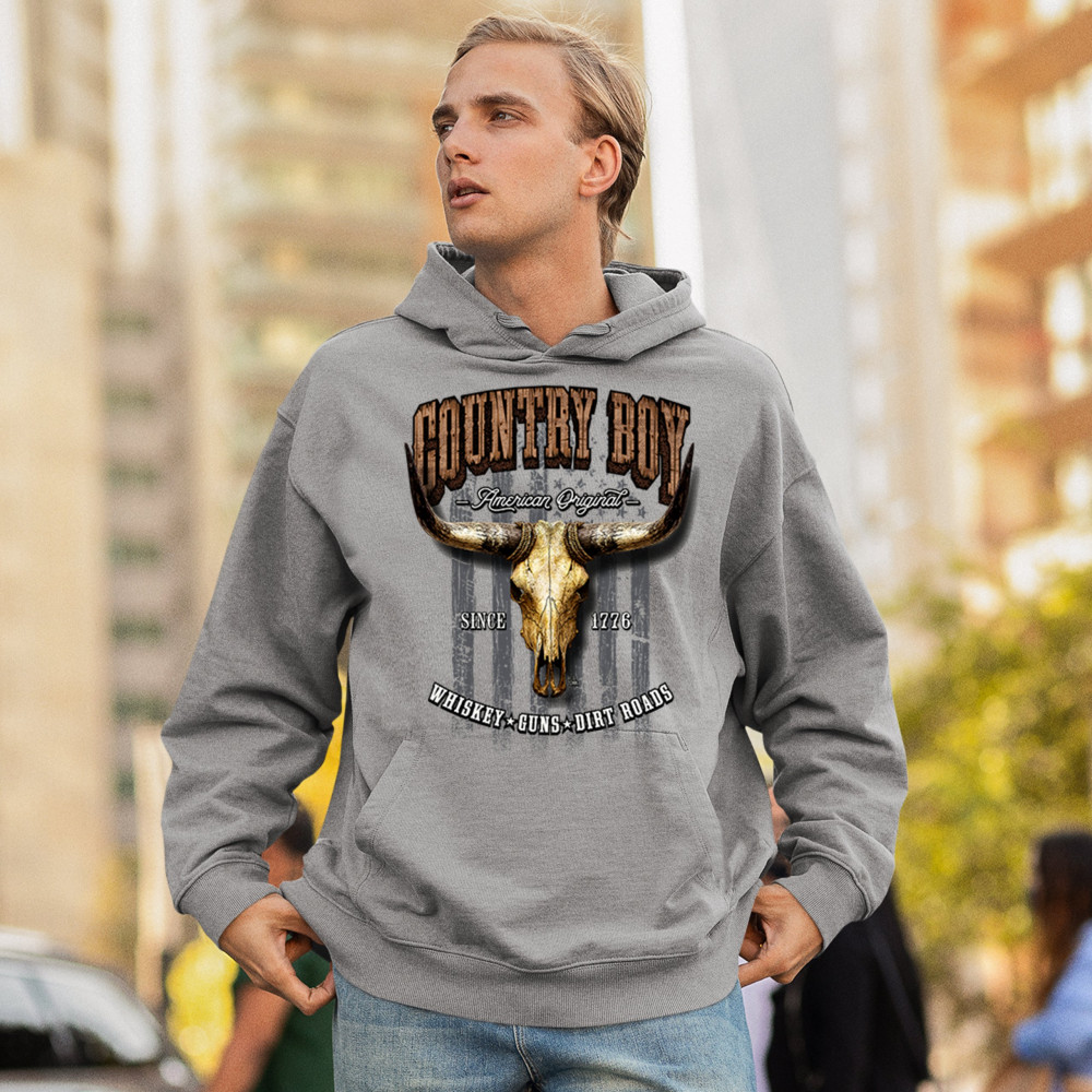 Country Boy – American Original. This bold western design captures the essence of southern living with a vintage bull skull, rustic lettering, and pride in whiskey, guns, and dirt roads. From 1776 to today, it honors the heritage of freedom-loving country men. Wear it to rodeos, bonfires, or muddy trails.