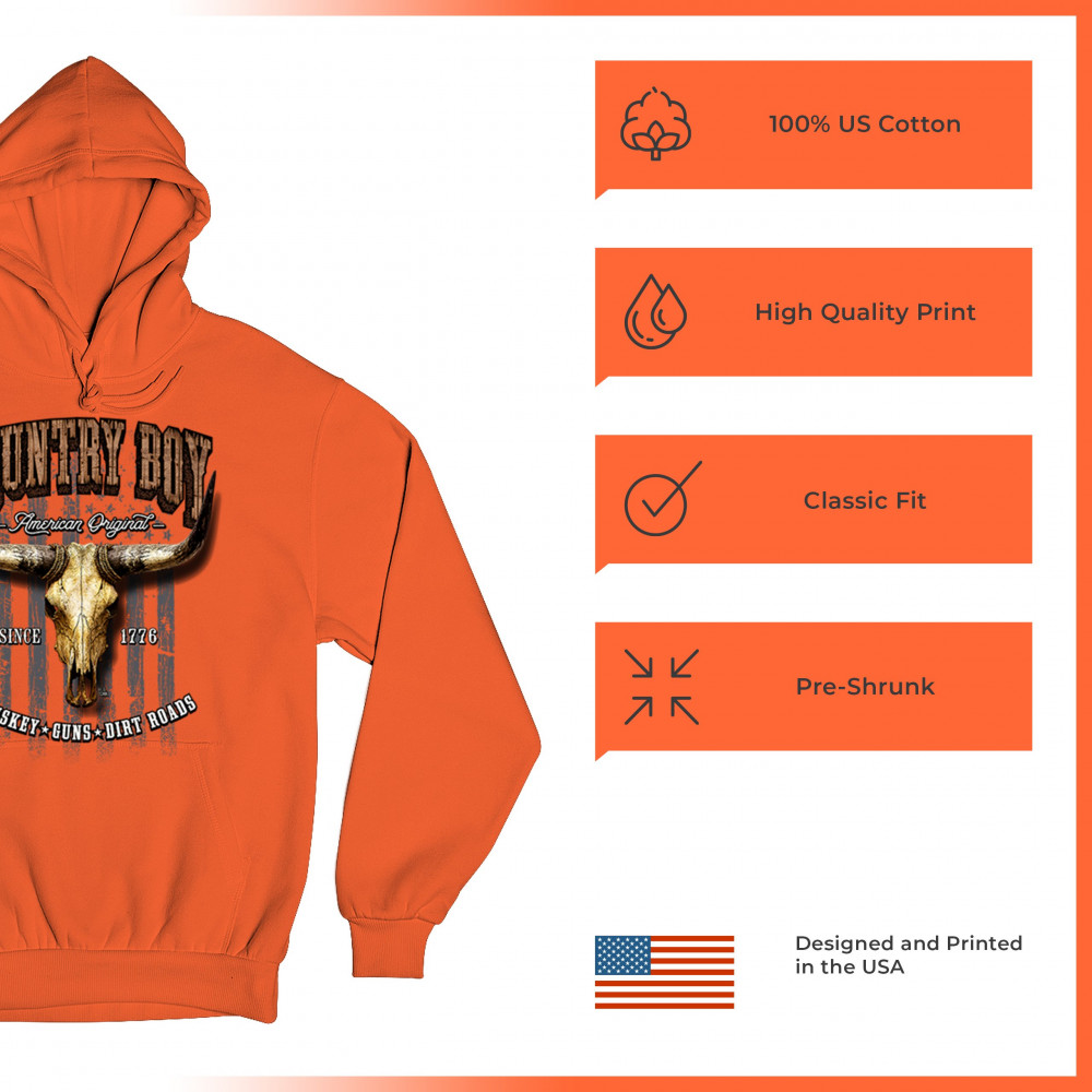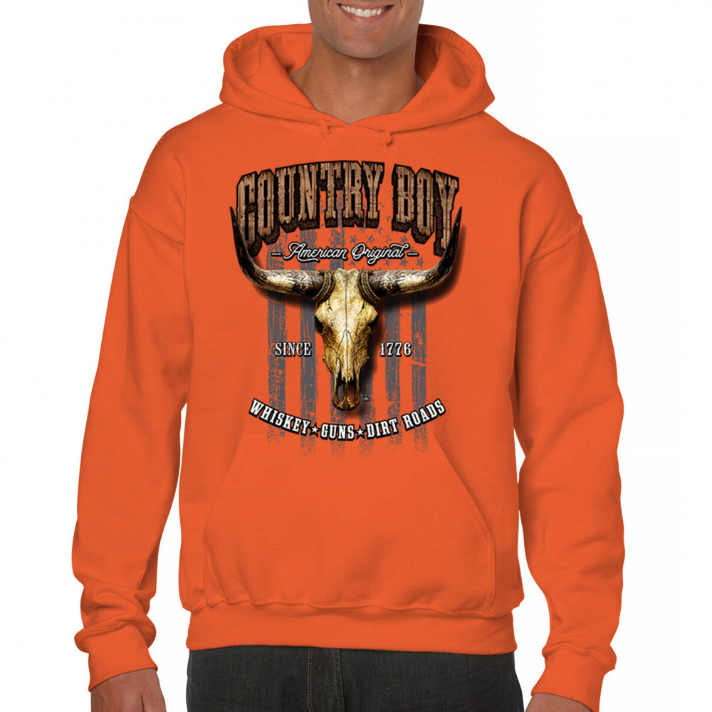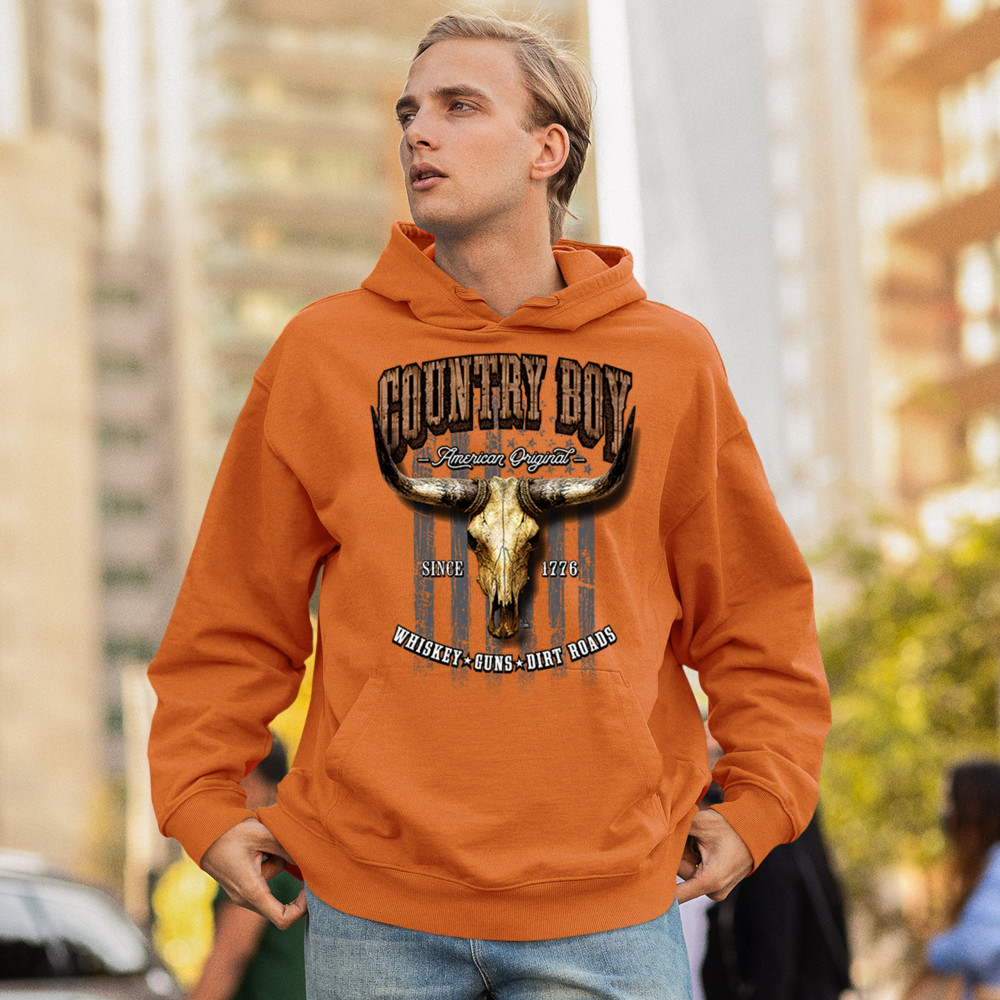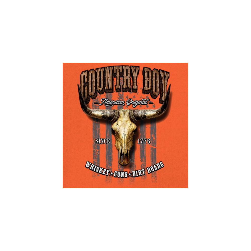 Country Boy – American Original. This bold western design captures the essence of southern living with a vintage bull skull, rustic lettering, and pride in whiskey, guns, and dirt roads. From 1776 to today, it honors the heritage of freedom-loving country men. Wear it to rodeos, bonfires, or muddy trails.