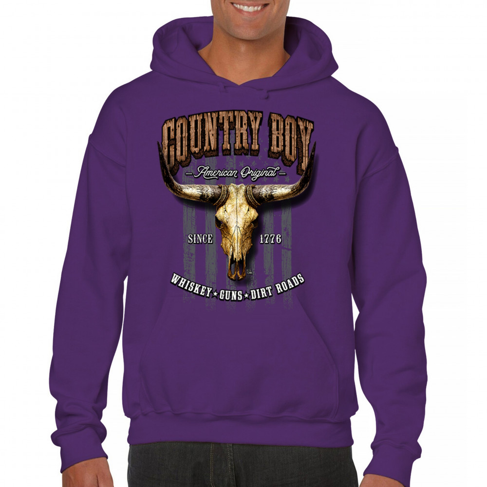 Country Boy – American Original. This bold western design captures the essence of southern living with a vintage bull skull, rustic lettering, and pride in whiskey, guns, and dirt roads. From 1776 to today, it honors the heritage of freedom-loving country men. Wear it to rodeos, bonfires, or muddy trails.