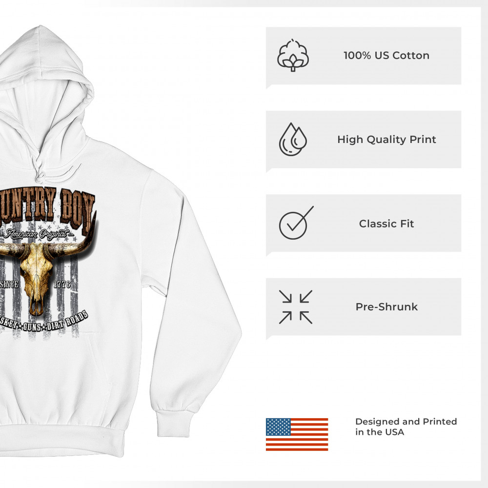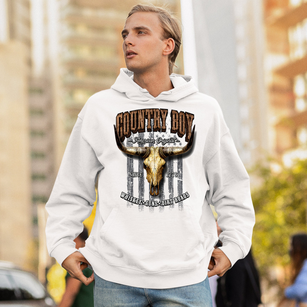 Country Boy – American Original. This bold western design captures the essence of southern living with a vintage bull skull, rustic lettering, and pride in whiskey, guns, and dirt roads. From 1776 to today, it honors the heritage of freedom-loving country men. Wear it to rodeos, bonfires, or muddy trails.