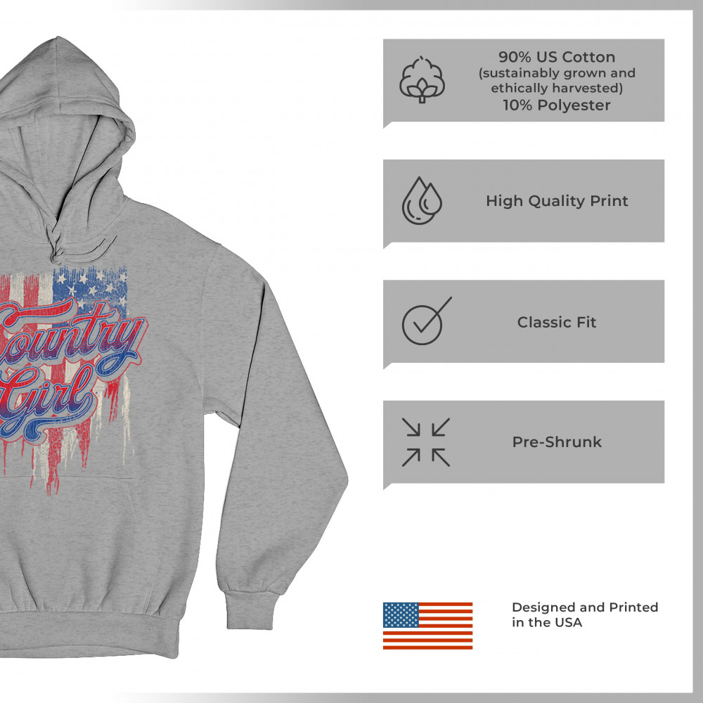 Patriotic country girl design with flag backdrop and bold script—perfect for rodeos, BBQs, ranch life, or 4th of July pride.