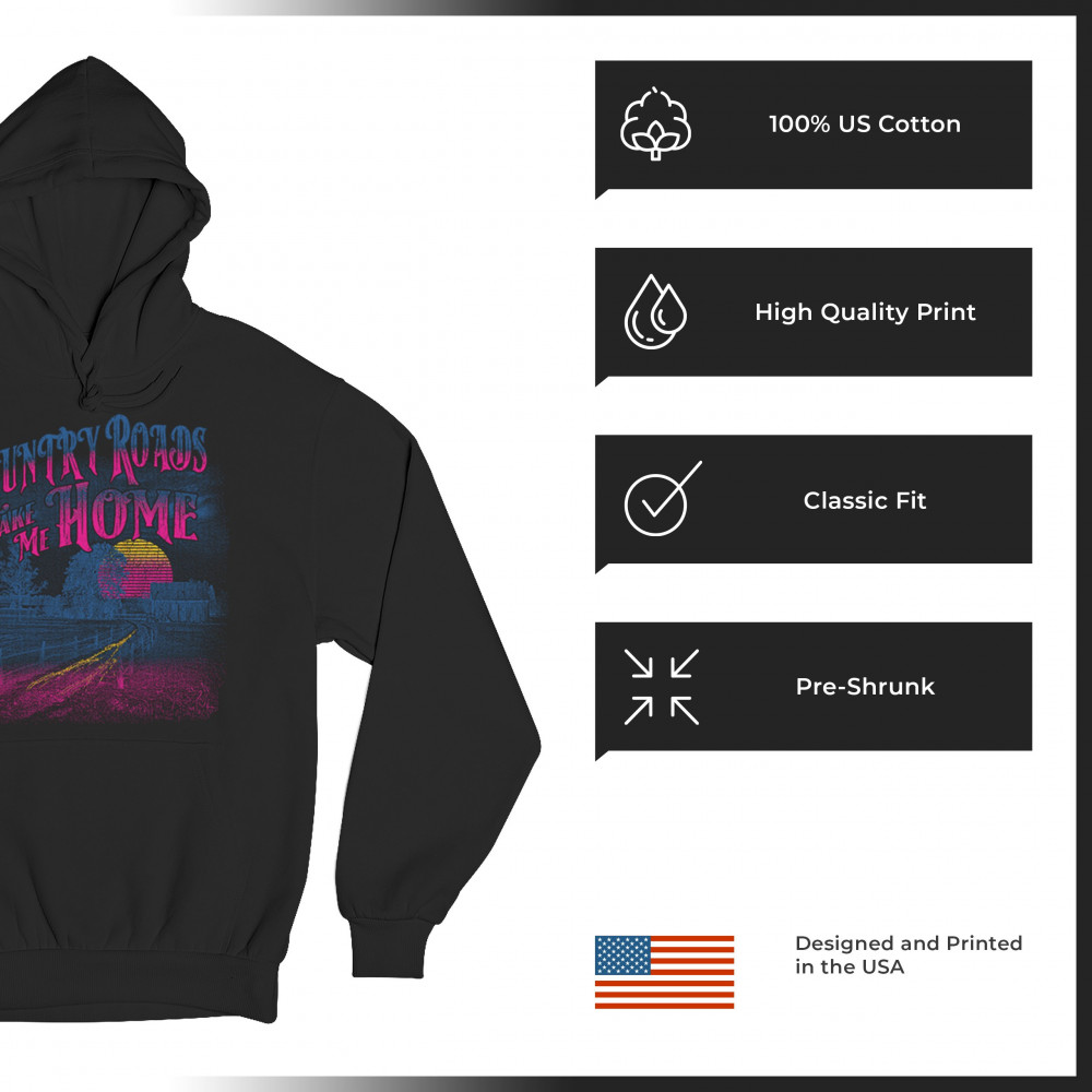 Bold and nostalgic, this "Country Roads Take Me Home" design blends retro-style typography with a vivid sunset scene. It’s perfect for fans of Americana music, scenic travel, and rural freedom. Great for road trips, camping, music events, or everyday wear that channels the spirit of country life.