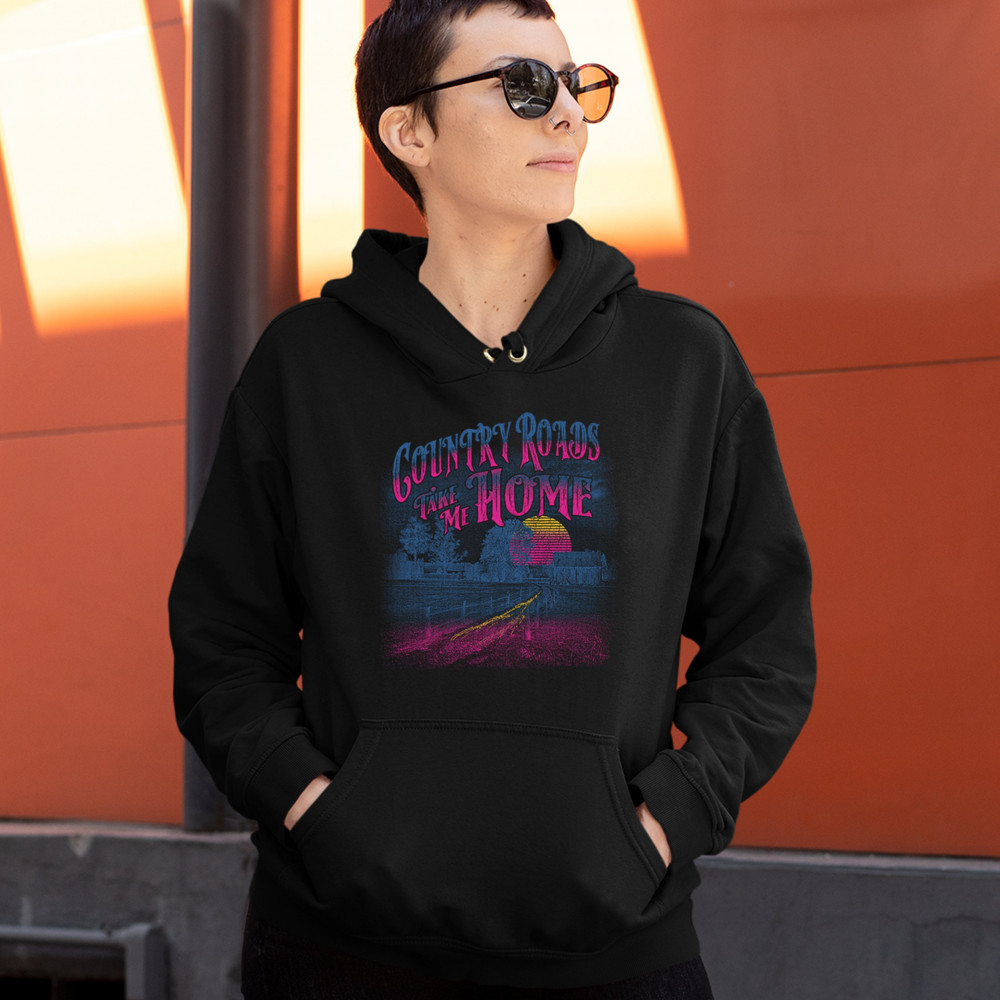 Retro sunset "Country Roads Take Me Home" design for road trip lovers, Americana fans, and country music souls. Bright, bold, and nostalgic.