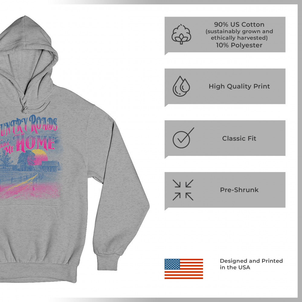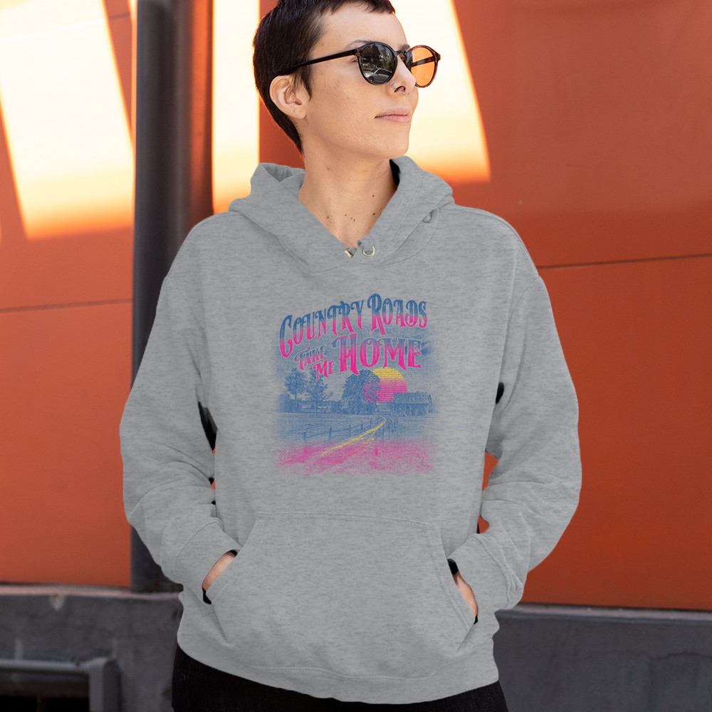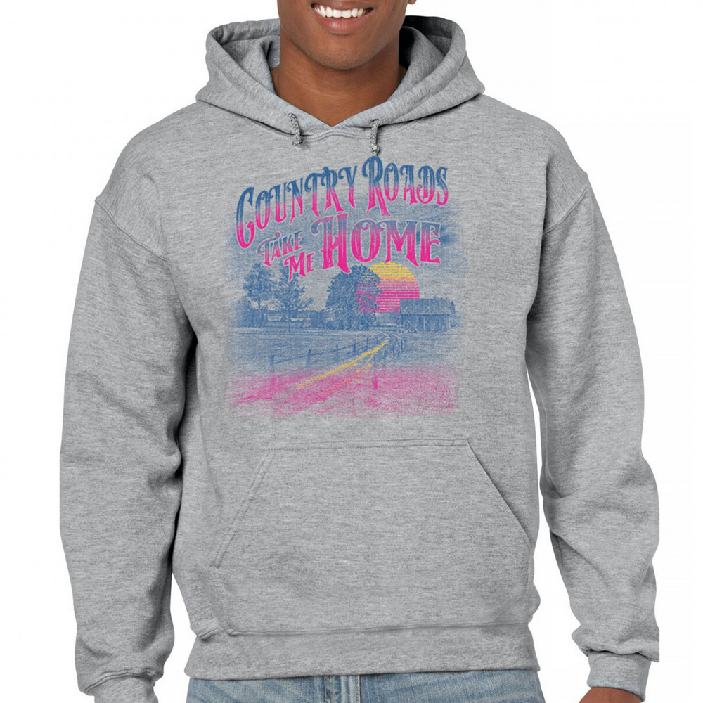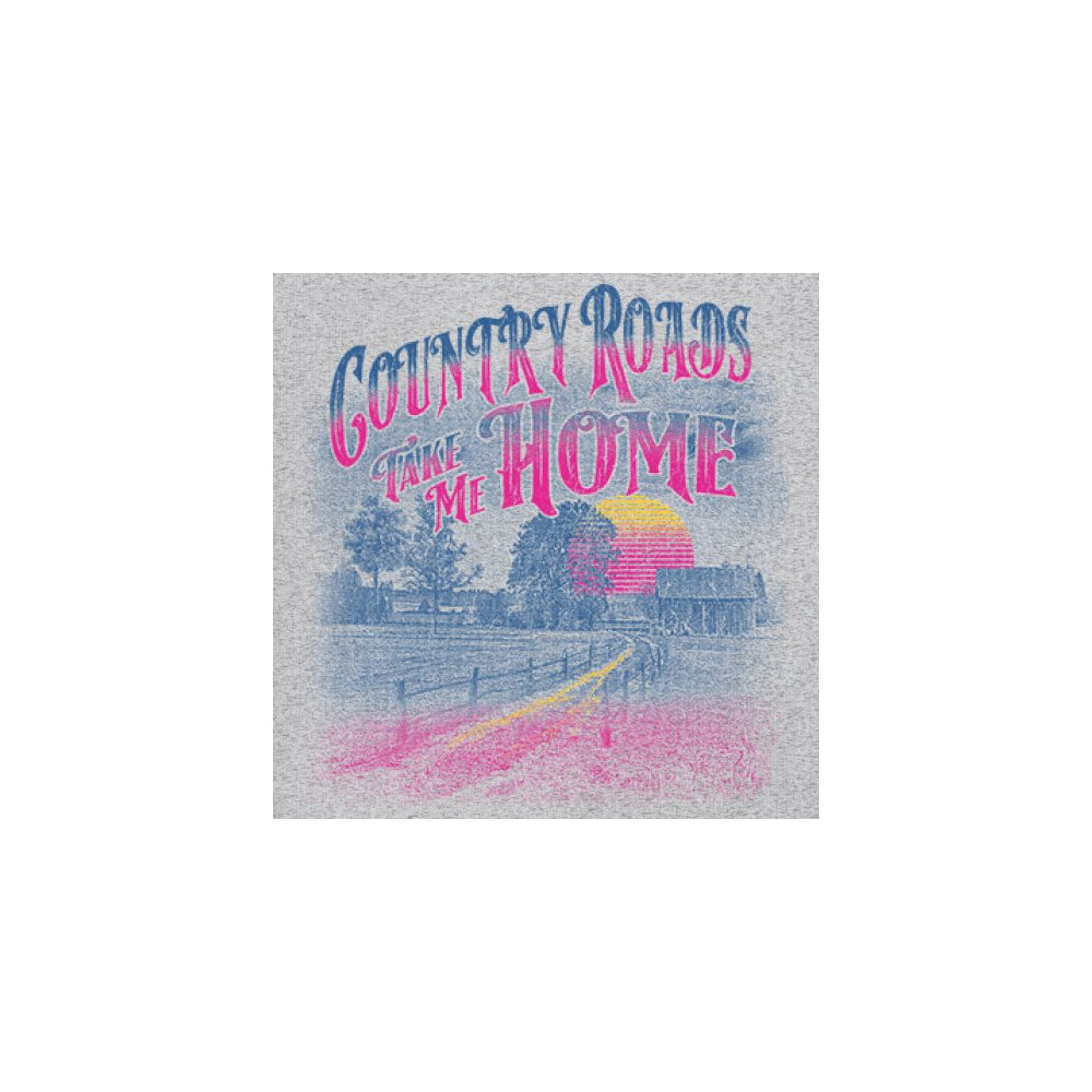 Retro sunset "Country Roads Take Me Home" design for road trip lovers, Americana fans, and country music souls. Bright, bold, and nostalgic.