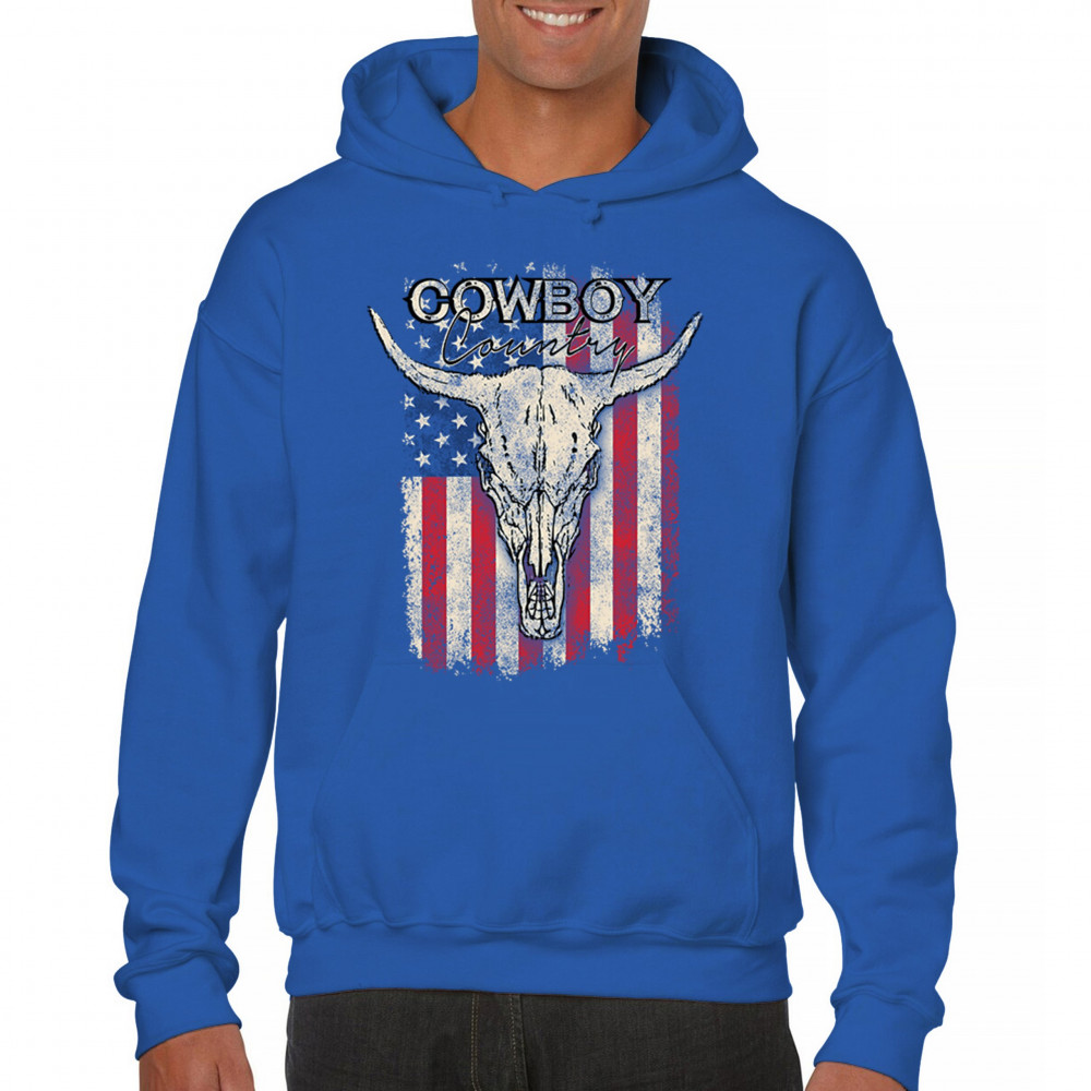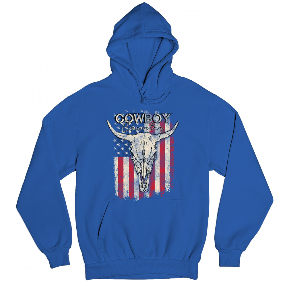 Cowboy Country steer skull design fuses rustic Americana, rodeo style, western heritage, and desert vibes for true frontier spirit.