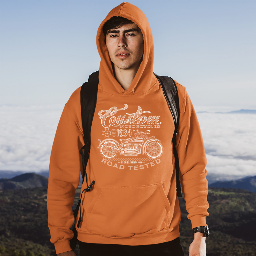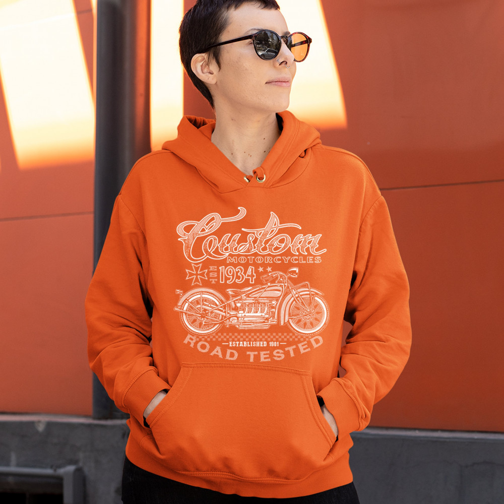 CUSTOM MOTORCYCLES ROAD TESTED sweatshirt bobber biker gang mc hoodie orange