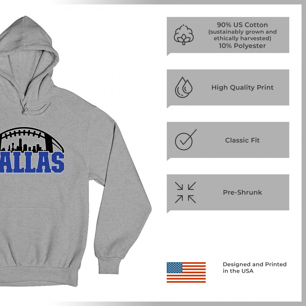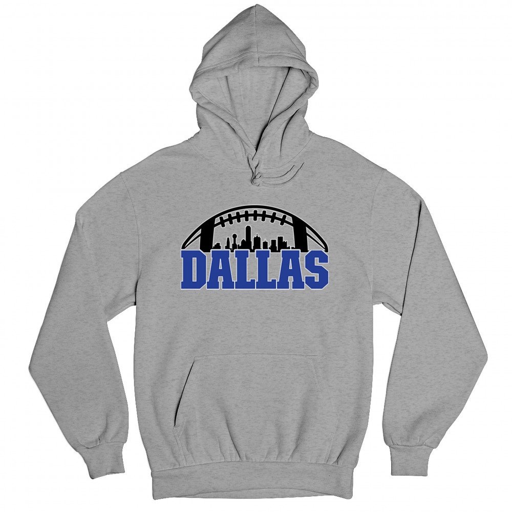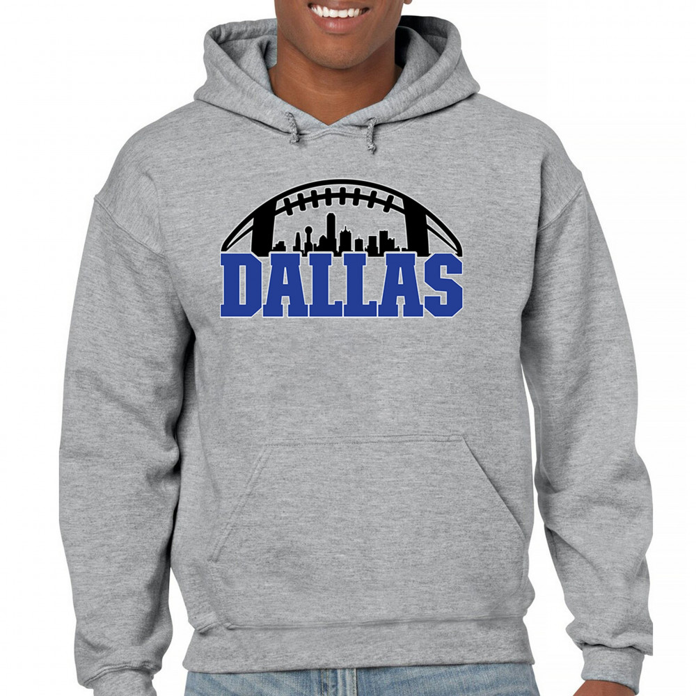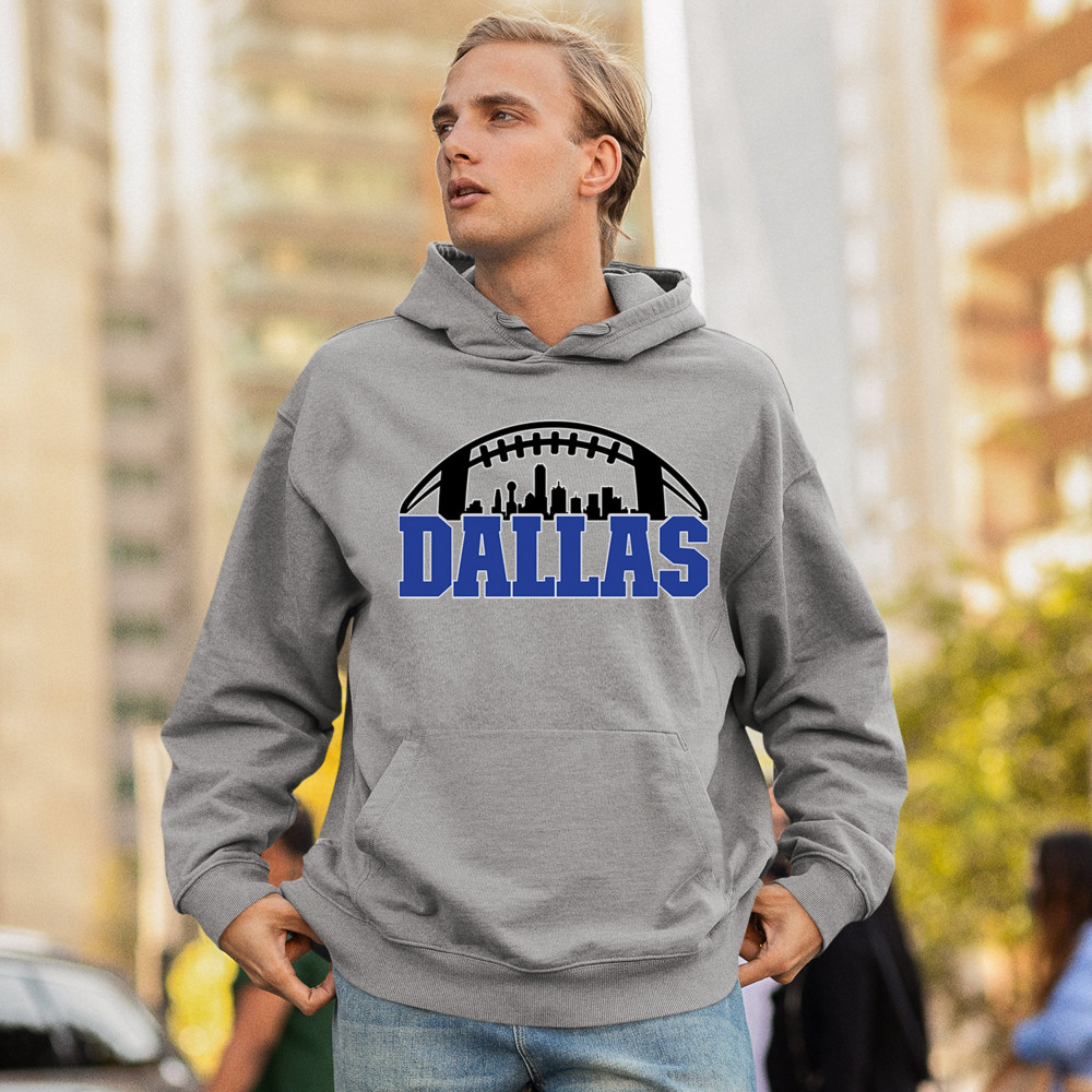 Show off your Dallas pride with a bold football-themed design featuring the city's skyline. Perfect for game days, tailgates, and passionate fans.