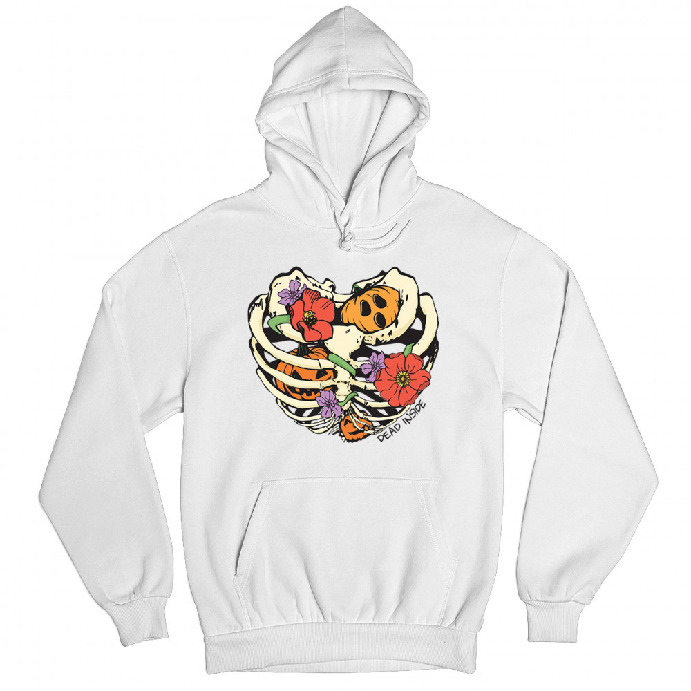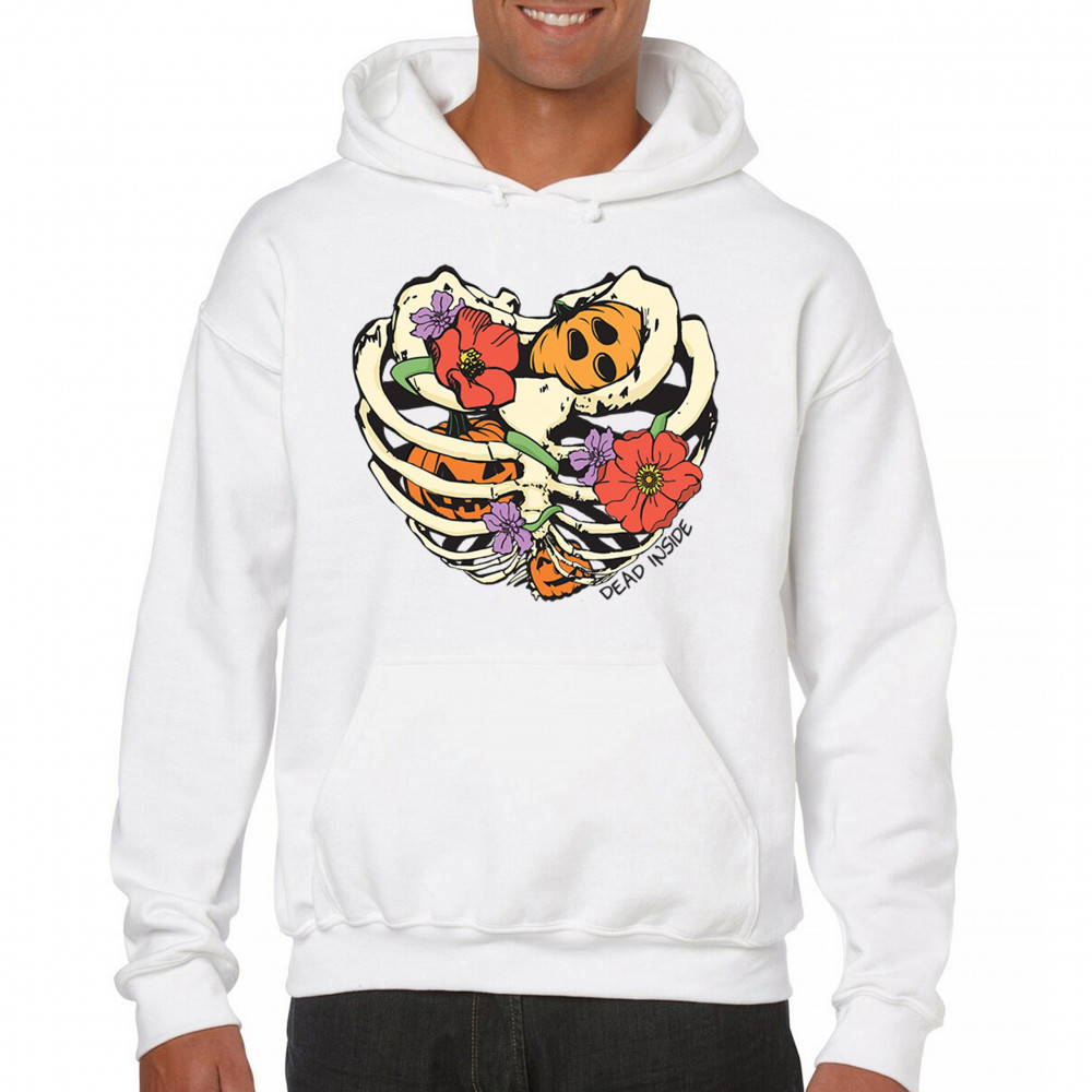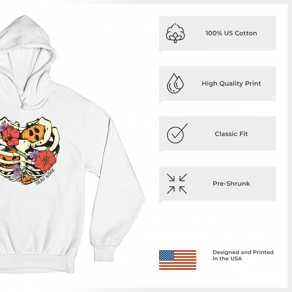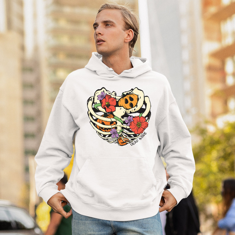 Celebrate Halloween with a quirky and cute design featuring a skeleton ribcage filled with pumpkins and flowers. Perfect for spooky season lovers!