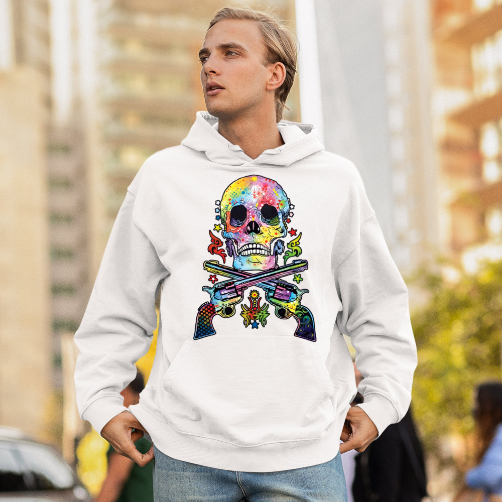 DEAN RUSSO ART SKULL AND GUNS sweatshirt colorful 2nd amendment hoodie white