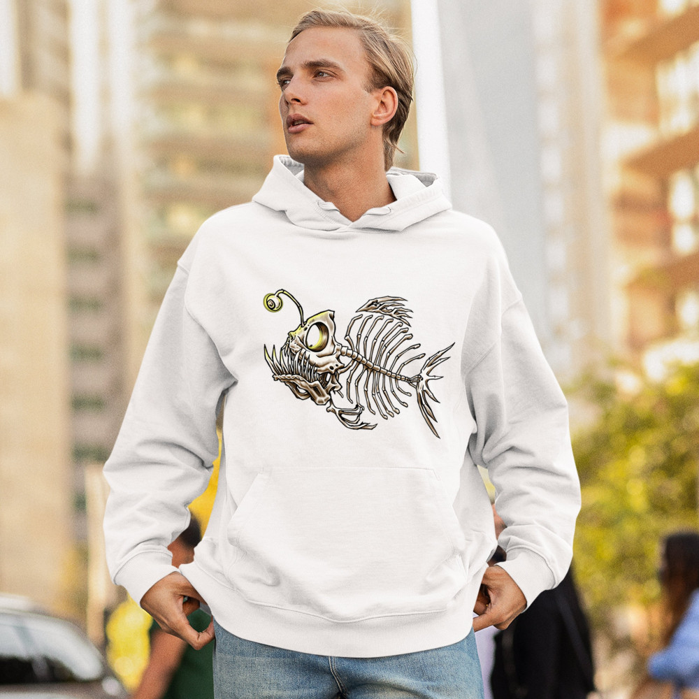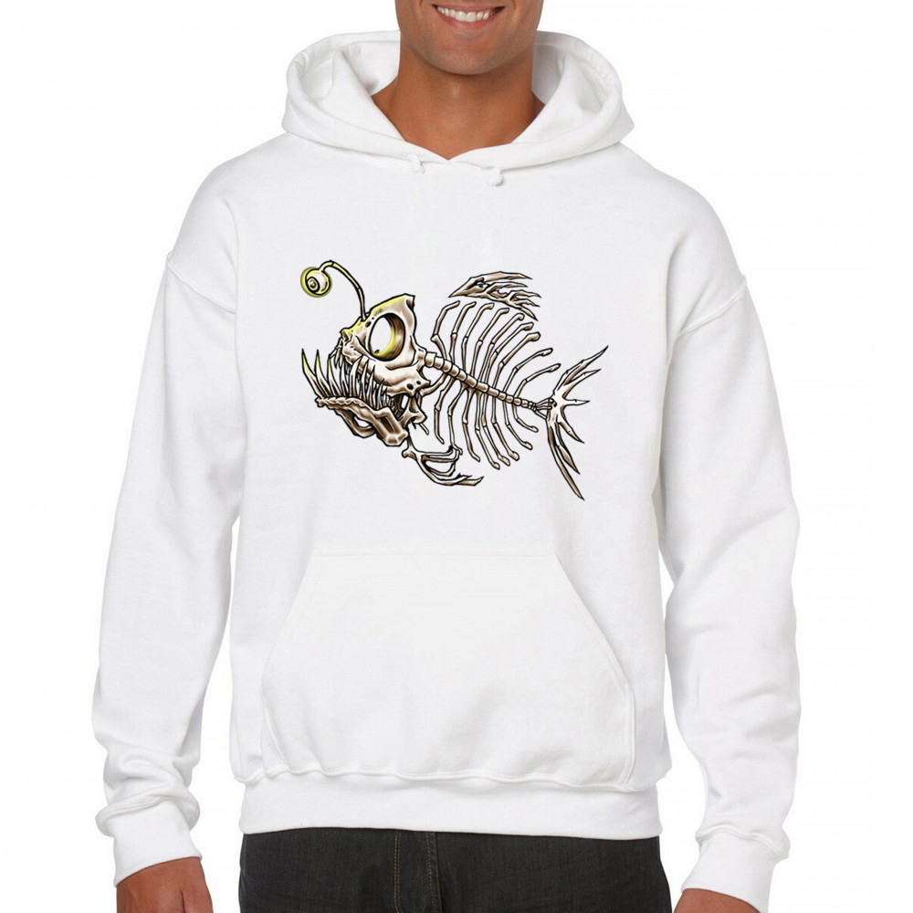 This highly detailed angler fish skeleton design features sharp bones, glowing lure eye, and deep sea terror aesthetic. Perfect for horror fans, marine biology lovers, and ocean adventurers, it combines underwater predator vibes with bone art flair. A great fit for Halloween, dive clubs, and dark sea aesthetics.
