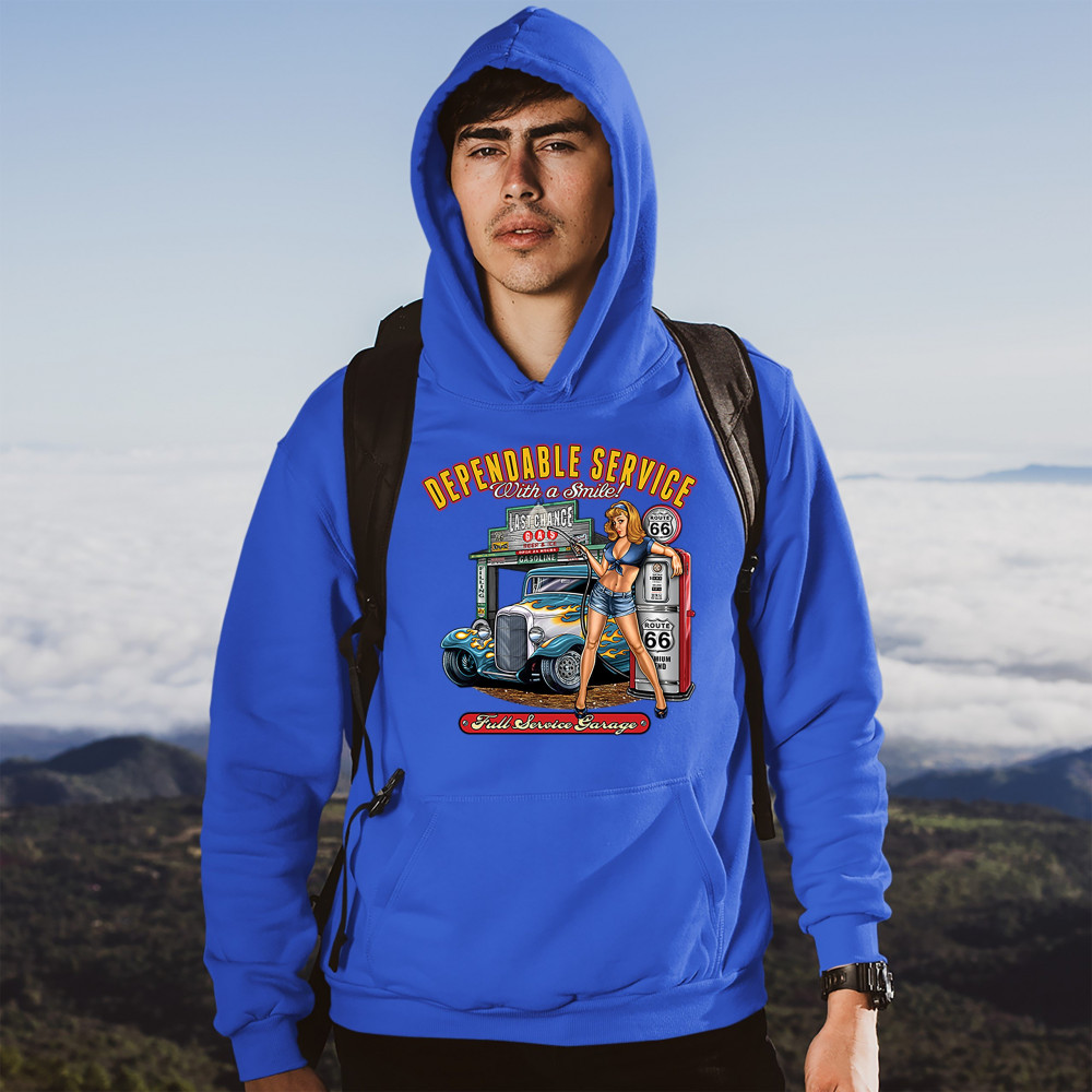DEPENDABLE SERVICE sweatshirt route 66 hot rod full service garage hoodie royal blue