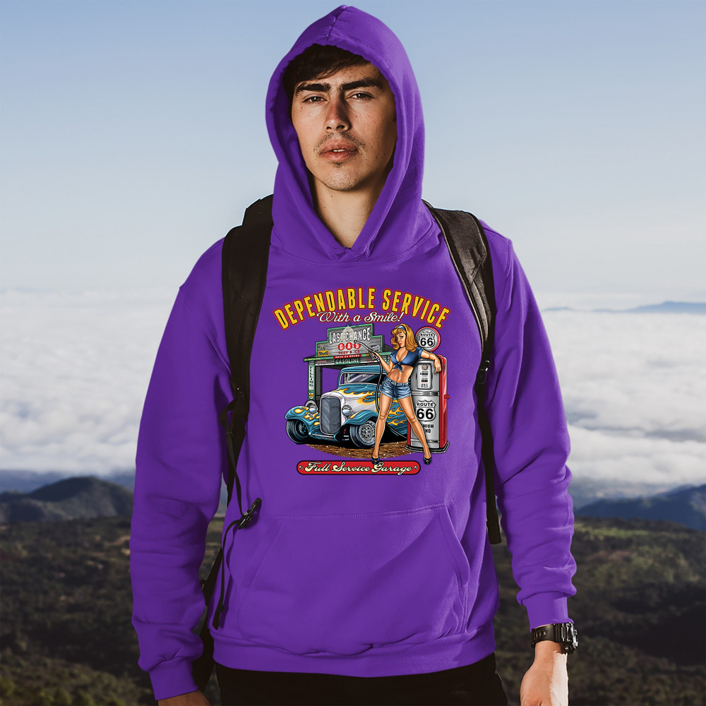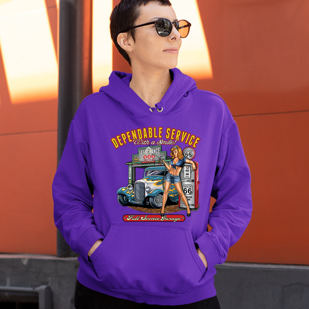 A print featuring a sexy pin-up girl standing by a gas pump with Route 66 signs on it. Behind her there is a garage with a hot rod parked at it. The print says: "Dependable Service With a Smile!" at the top and "Full Service Garage" at the bottom. A great