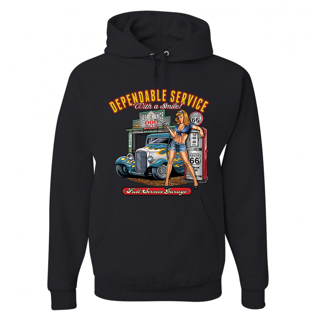 A print featuring a sexy pin-up girl standing by a gas pump with Route 66 signs on it. Behind her there is a garage with a hot rod parked at it. The print says: "Dependable Service With a Smile!" at the top and "Full Service Garage" at the bottom. A great