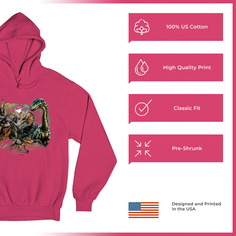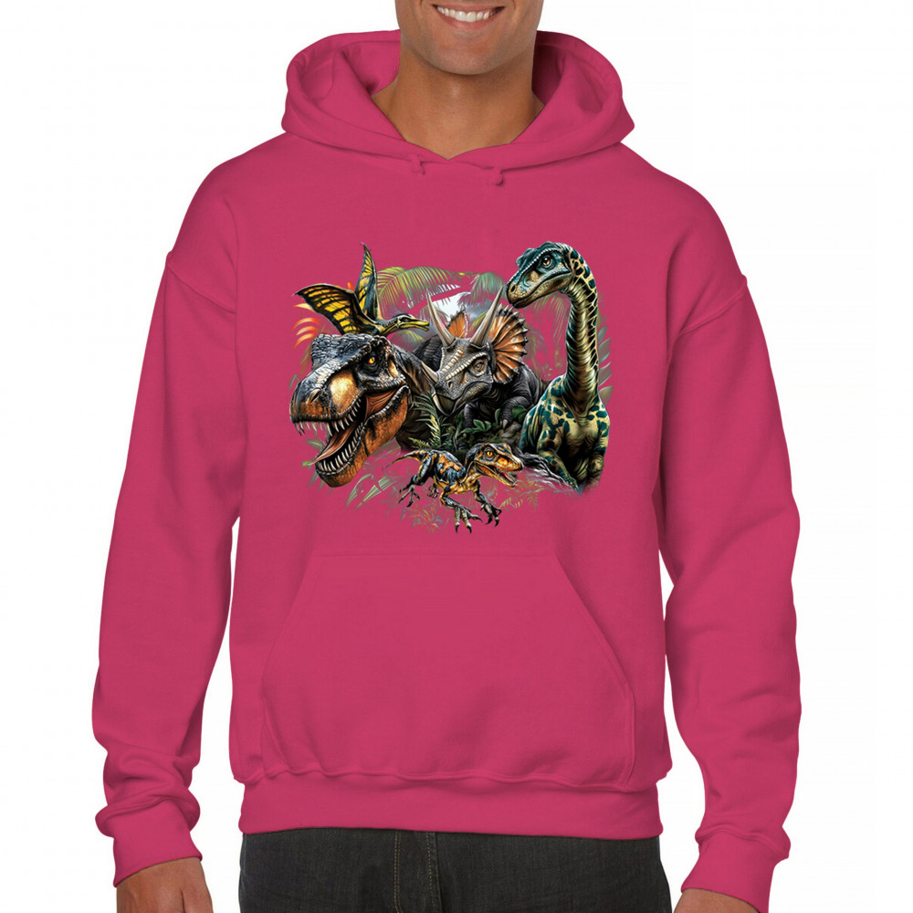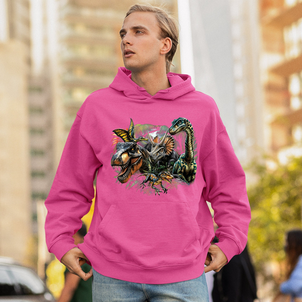 Get prehistoric with this electrifying design featuring a full dino squad in vibrant jungle detail. Includes t rex, triceratops, raptor, brachiosaurus, and pteranodon, all surrounded by tropical foliage. A perfect pick for dinosaur fans, fossil hunters, Jurassic birthday parties, or anyone who loves bold, wild, nature-themed art.