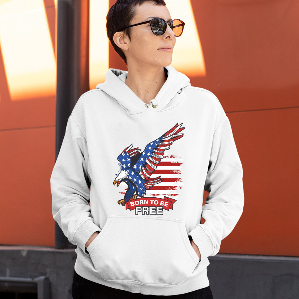 A patriotic print saying "Born to Be Free" and featuring a diving American Bald Eagle. In the background there is a distressed American Flag and the eagle is covered with Stars and Stripes. Great choice to wear on Independence Day or any other patriotic h