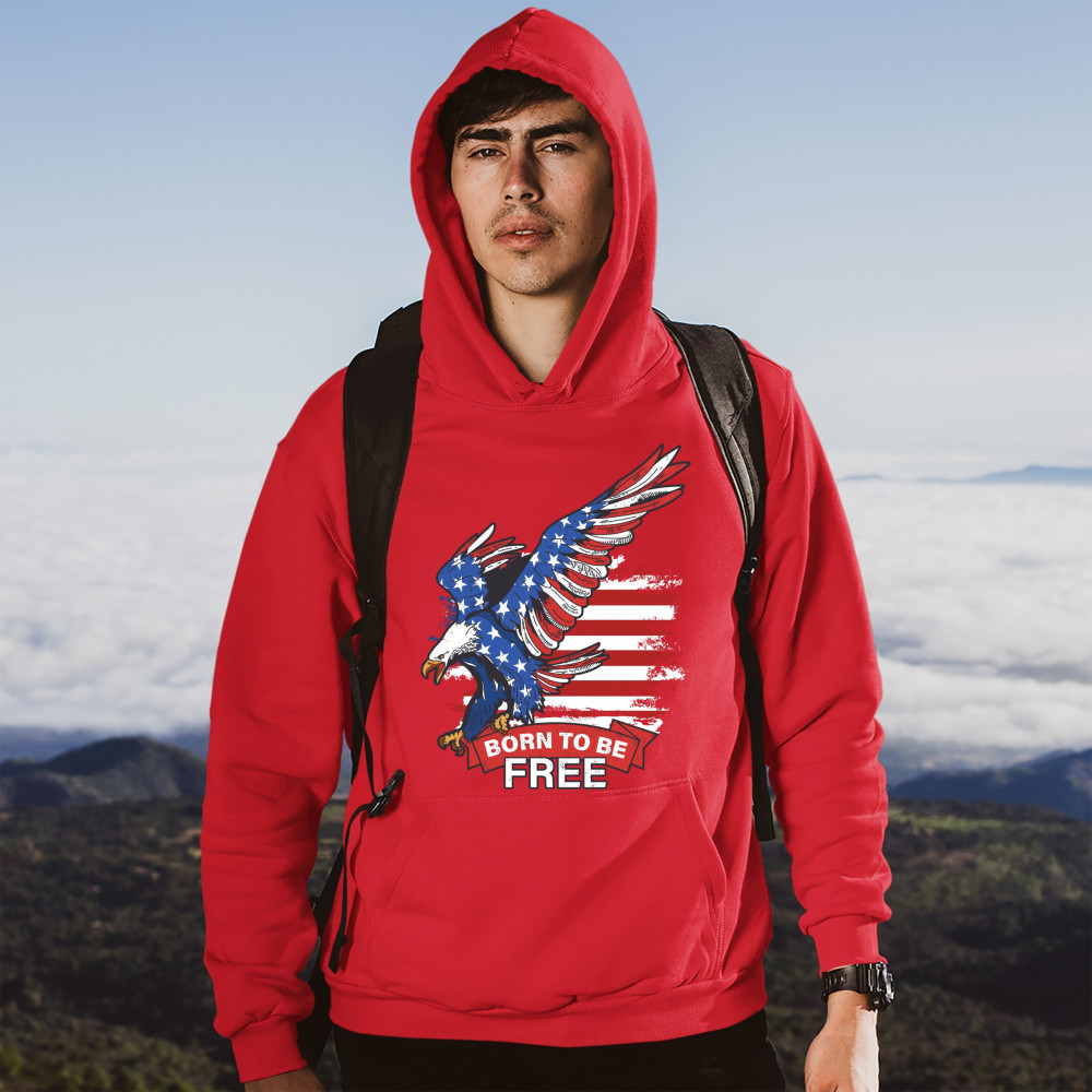 A patriotic print saying "Born to Be Free" and featuring a diving American Bald Eagle. In the background there is a distressed American Flag and the eagle is covered with Stars and Stripes. Great choice to wear on Independence Day or any other patriotic h