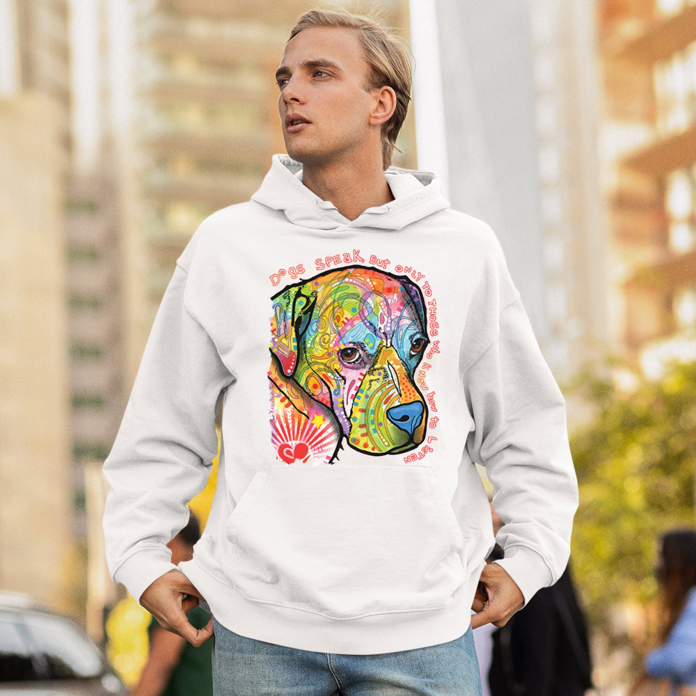 DOGS SPEAK TO THOSE WHO LISTEN sweatshirt dean russo neon pet puppy hoodie white
