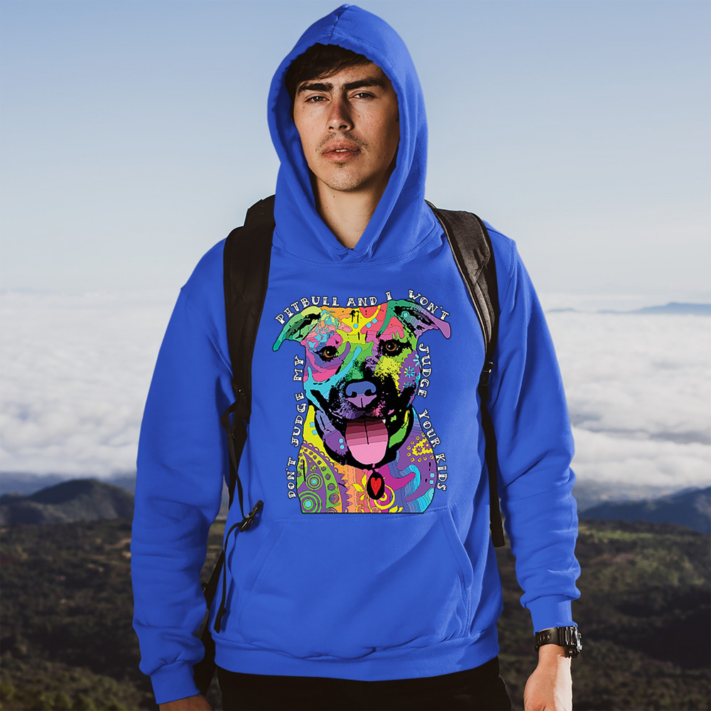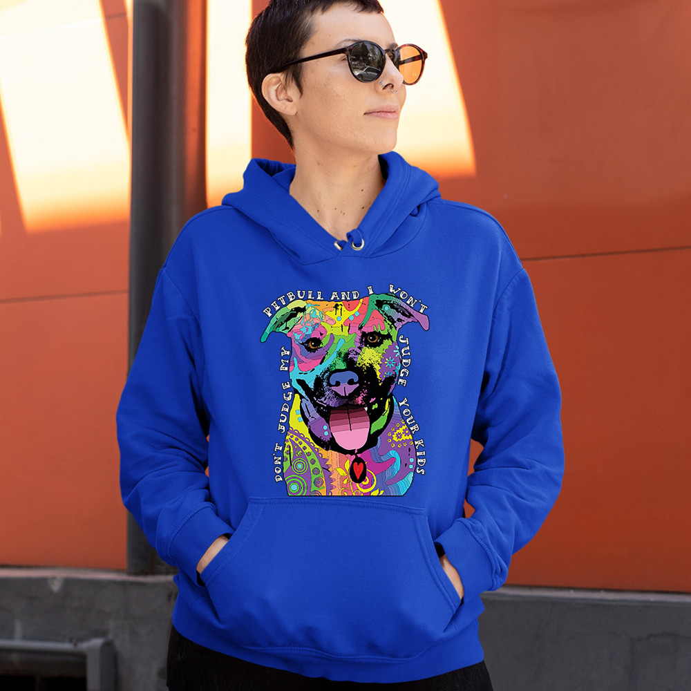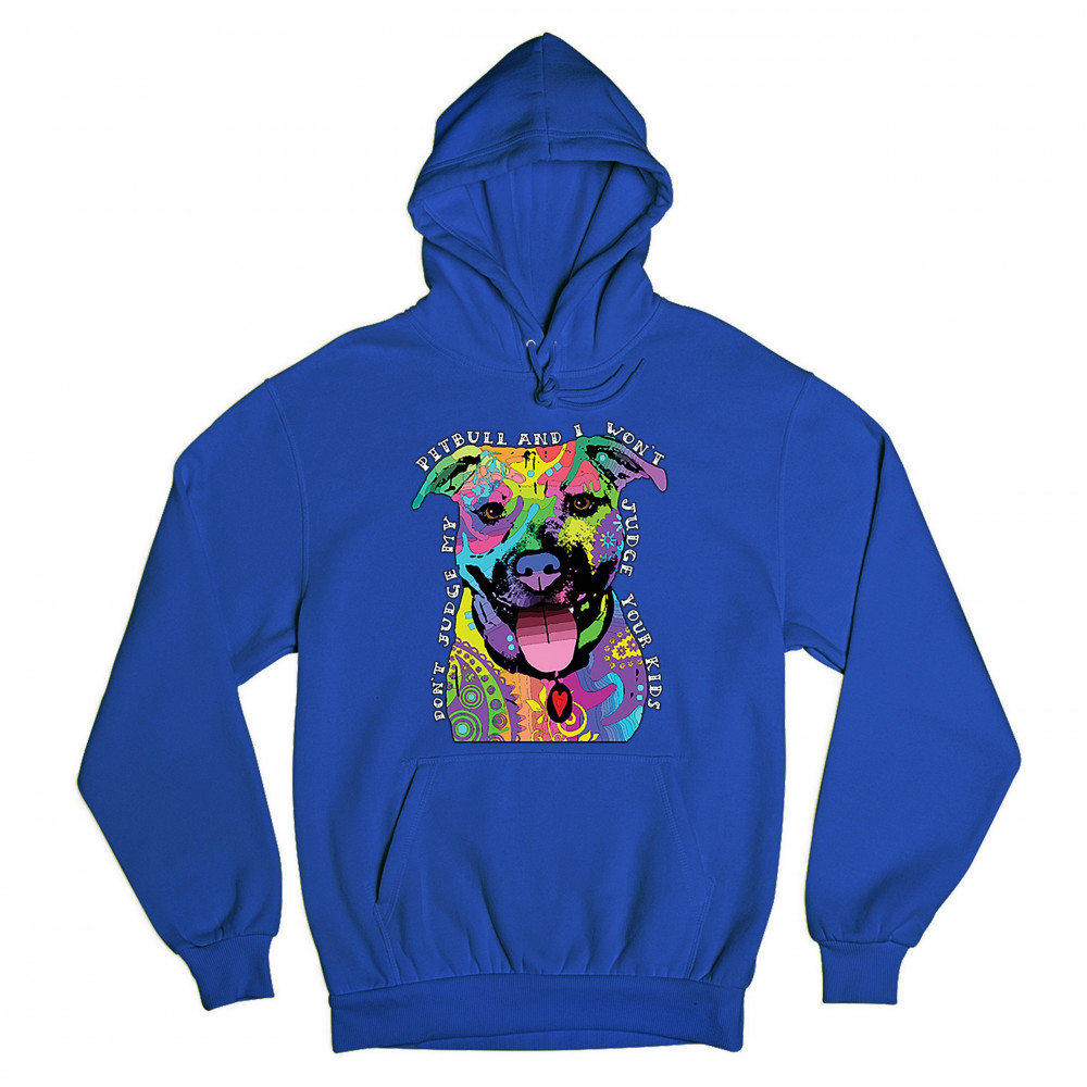 DON'T JUDGE MY PIT BULL sweatshirt funny andy maxx dog lover pet owner hoodie royal blue