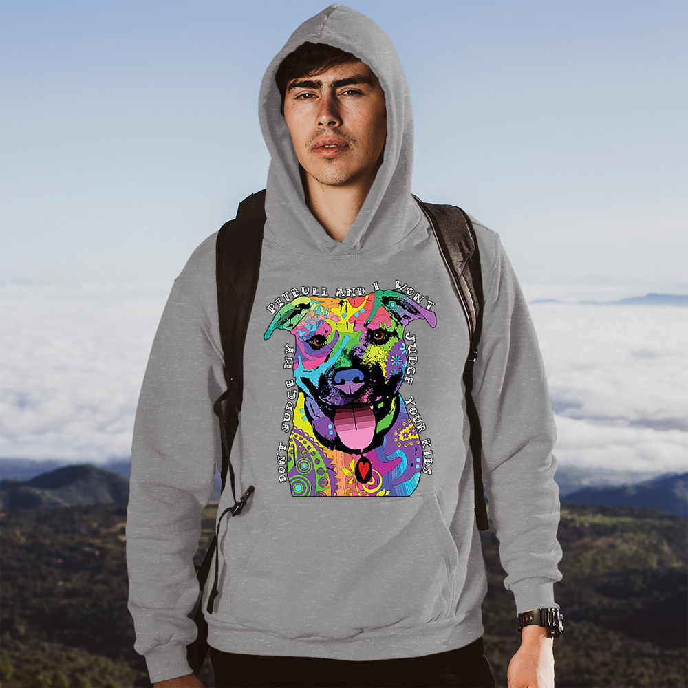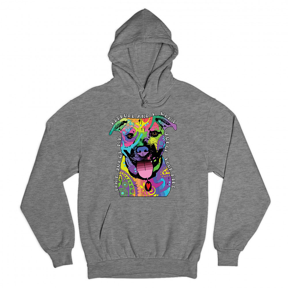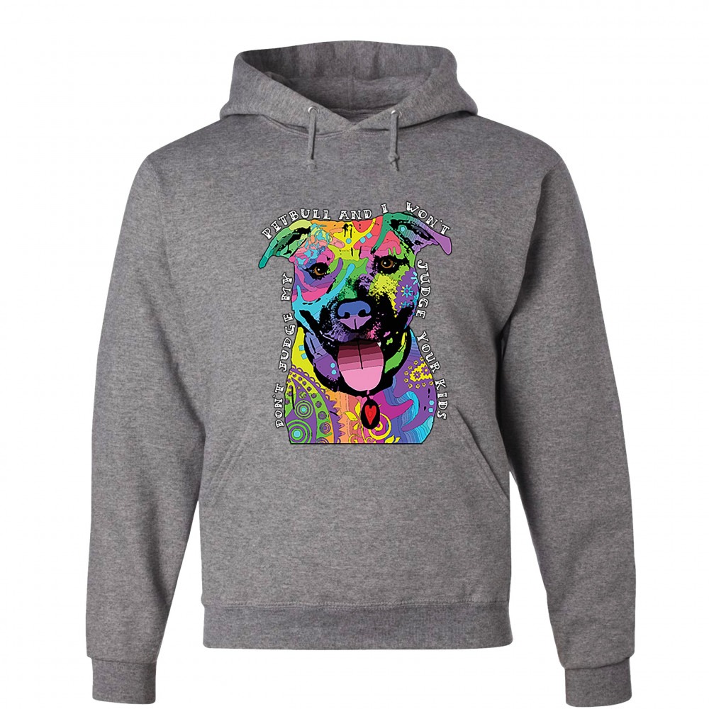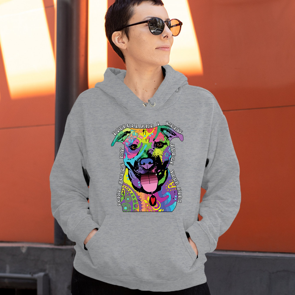 DON'T JUDGE MY PIT BULL sweatshirt funny andy maxx dog lover pet owner hoodie gray