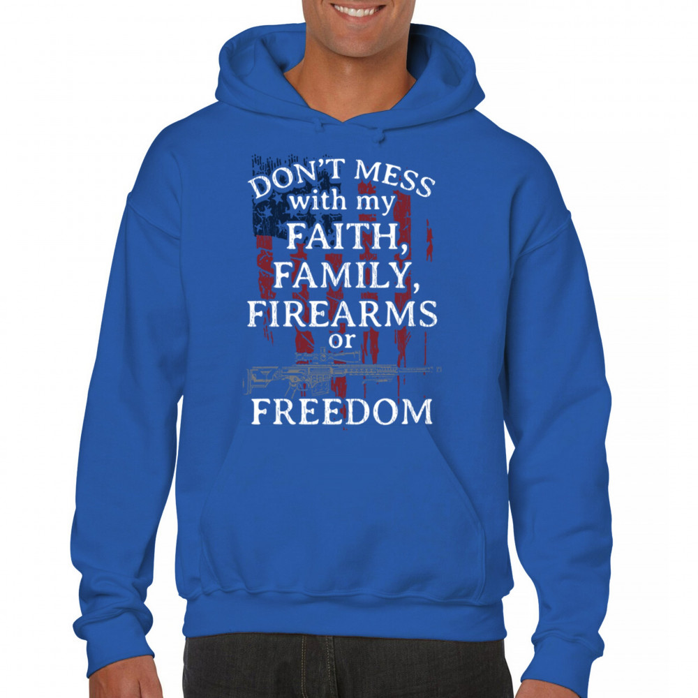 Celebrate your patriotism and core values with this powerful shirt featuring "Don't Mess with My Faith, Family, Firearms, or Freedom" set against a distressed American flag. This shirt is perfect for patriots, veterans, and those who hold their religious beliefs and the right to bear arms in high regard. Made from high-quality fabric, it ensures comfort and durability for everyday wear. Wear it proudly at patriotic events, on the 4th of July, or anytime you want to make a strong statement about your beliefs. It’s an excellent gift for anyone who shares these values and supports the American flag and the stars and stripes.