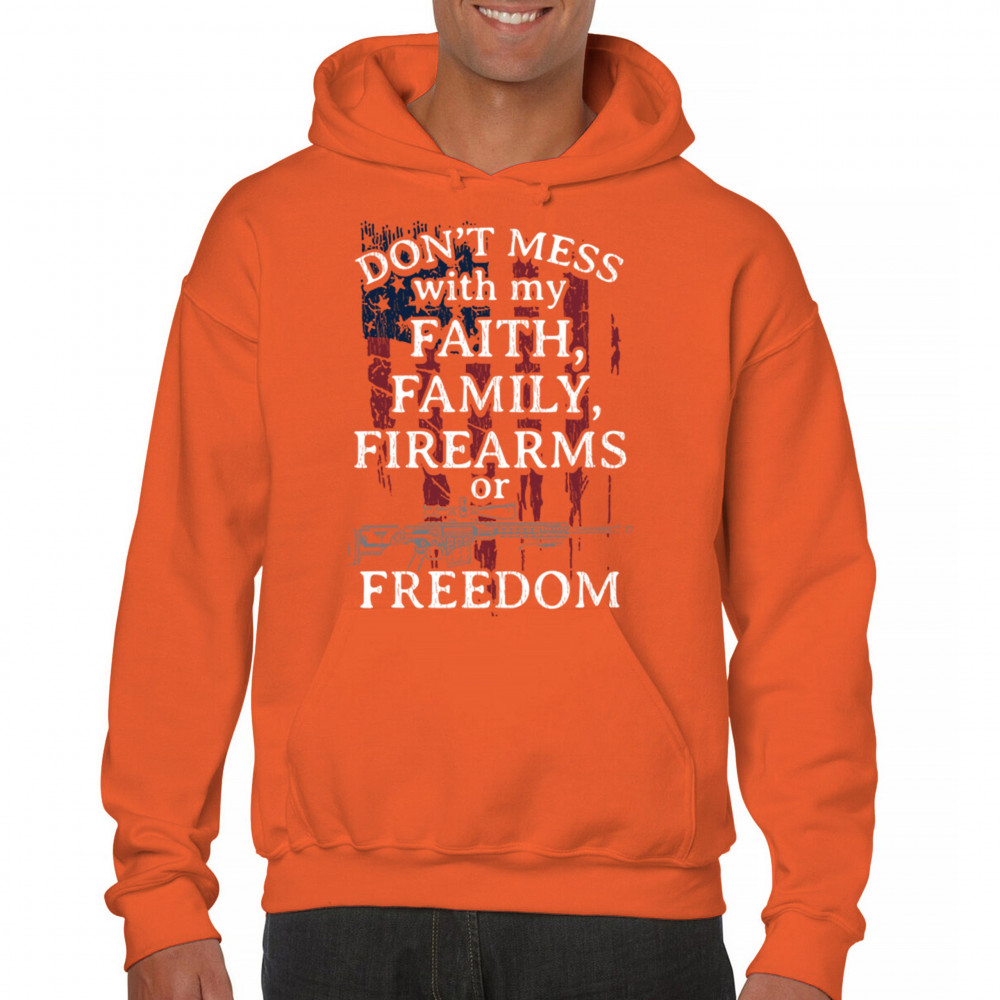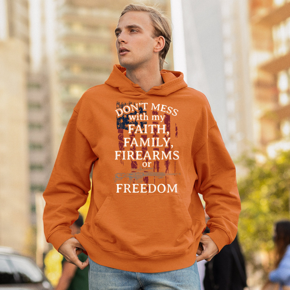 Celebrate your patriotism and core values with this powerful shirt featuring "Don't Mess with My Faith, Family, Firearms, or Freedom" set against a distressed American flag. This shirt is perfect for patriots, veterans, and those who hold their religious beliefs and the right to bear arms in high regard. Made from high-quality fabric, it ensures comfort and durability for everyday wear. Wear it proudly at patriotic events, on the 4th of July, or anytime you want to make a strong statement about your beliefs. It’s an excellent gift for anyone who shares these values and supports the American flag and the stars and stripes.