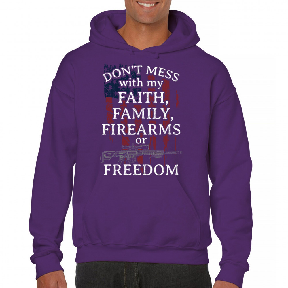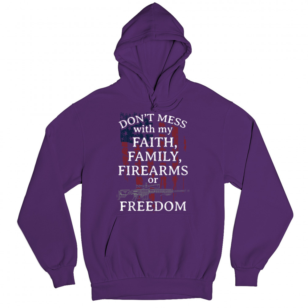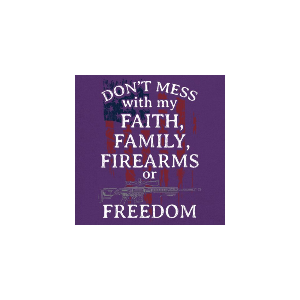 Celebrate your patriotism and core values with this powerful shirt featuring "Don't Mess with My Faith, Family, Firearms, or Freedom" set against a distressed American flag. This shirt is perfect for patriots, veterans, and those who hold their religious beliefs and the right to bear arms in high regard. Made from high-quality fabric, it ensures comfort and durability for everyday wear. Wear it proudly at patriotic events, on the 4th of July, or anytime you want to make a strong statement about your beliefs. It’s an excellent gift for anyone who shares these values and supports the American flag and the stars and stripes.