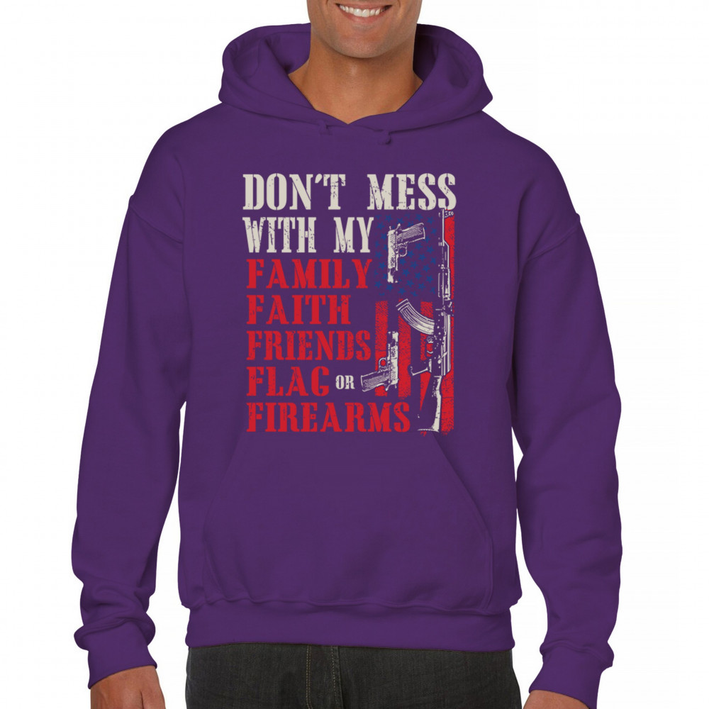 Don’t mess with a patriot’s core. This powerful design shouts loyalty to family, faith, friends, flag, and firearms. Featuring bold lettering on an American flag backdrop, it’s made for defenders of freedom, gun rights, and American values. Ideal for veterans, 2A supporters, and anyone who won’t back down from defending what they love.