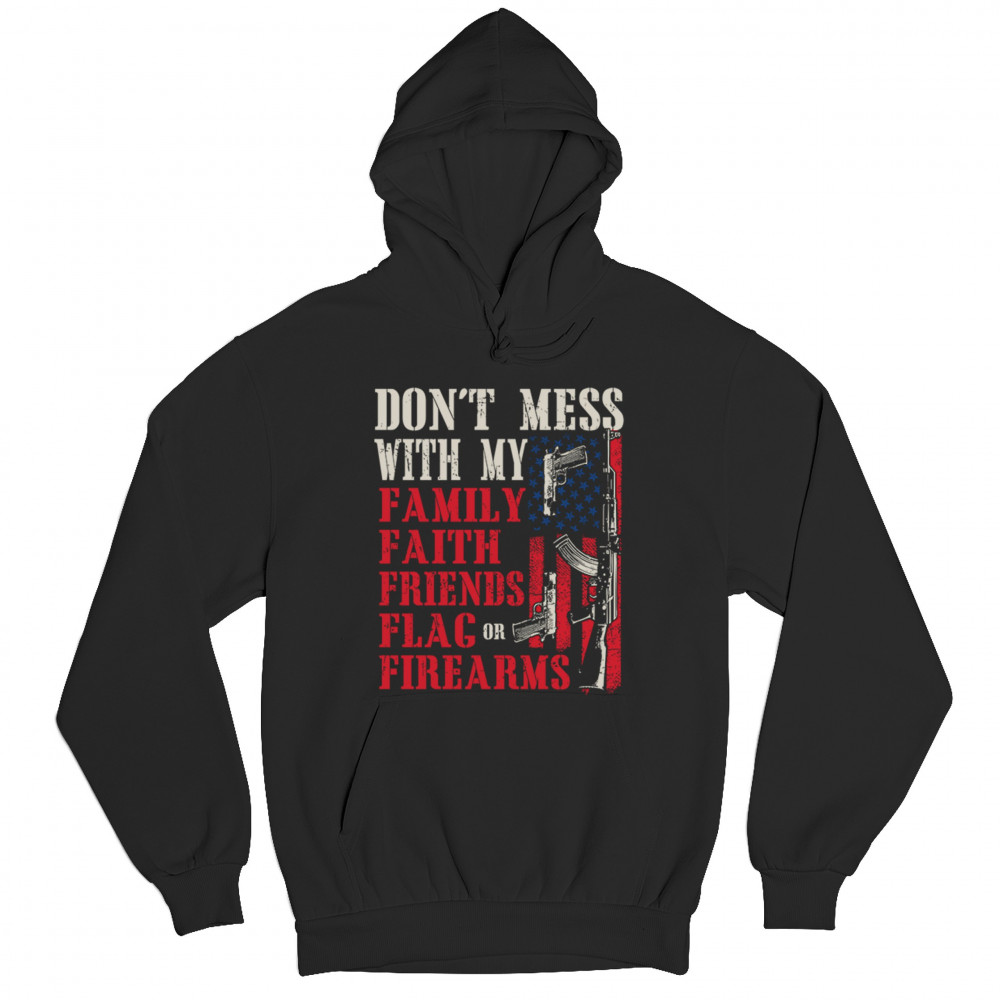 Patriotic design for gun owners and liberty-lovers. Bold message defends family, flag, and firearms with unapologetic American pride.