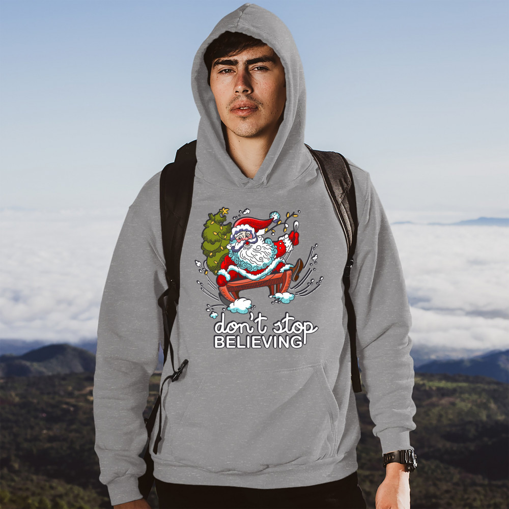 DON'T STOP BELIEVING sweatshirt christmas holiday spirit santa claus hoodie gray