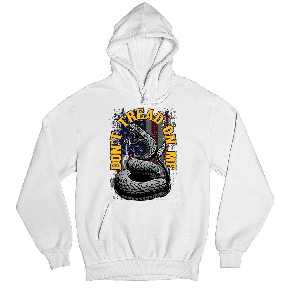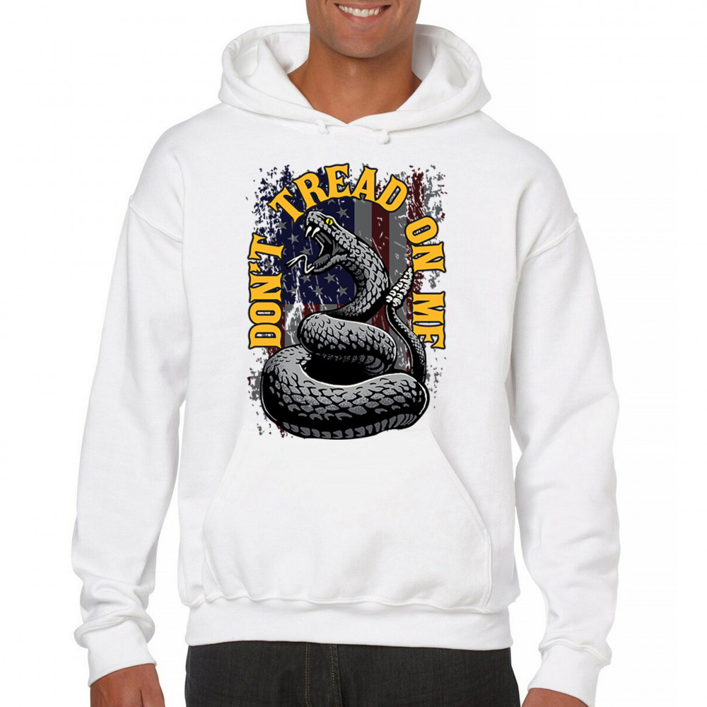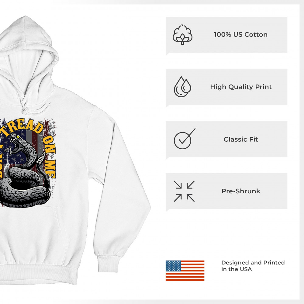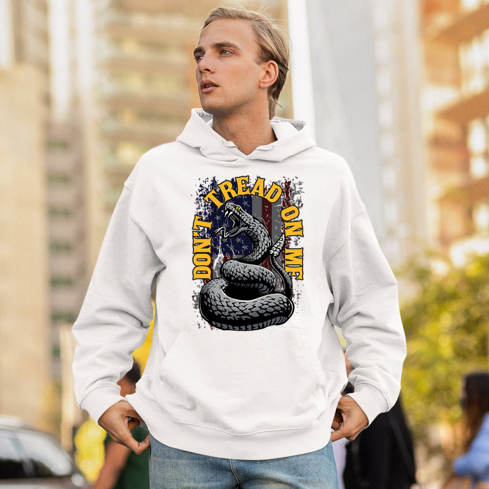 Bold "Don't Tread on Me" design with snake and American flag. Ideal for patriots. Show your love for freedom and independence.
