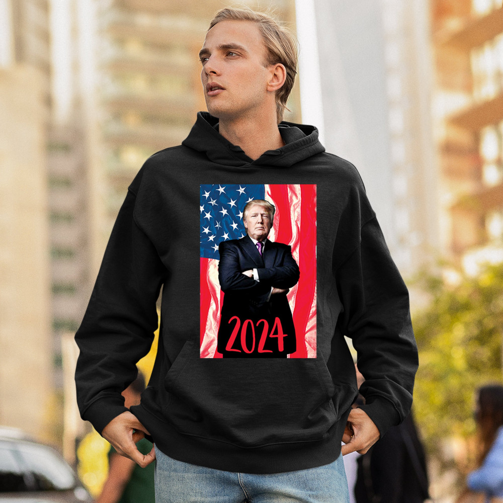 Showcase your unwavering support and patriotic pride with our exclusive design, featuring Donald Trump poised before the American flag with "2024" inscribed below. This powerful imagery is a testament to the conservative journey towards victory, echoing the calls of "America First" and unity under a common cause. It's a tribute to those who believe in standing firm, fueled by trust in God and a commitment to the principles that define us. A must-have for every supporter ready to be part of the next chapter in American history.