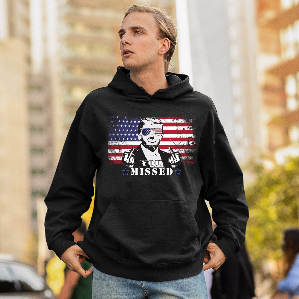 Embrace the spirit of patriotism and resilience with this powerful design showcasing Donald Trump in bold American flag sunglasses. Ideal for Trump rallies, political gatherings, and other patriotic events, this graphic is perfect for conservatives and Republicans alike. Show your unwavering support for Trump and the belief in making America great again. This striking design is not only a great addition to your wardrobe but also an excellent gift for fellow supporters. Wear it with pride and join the movement today.