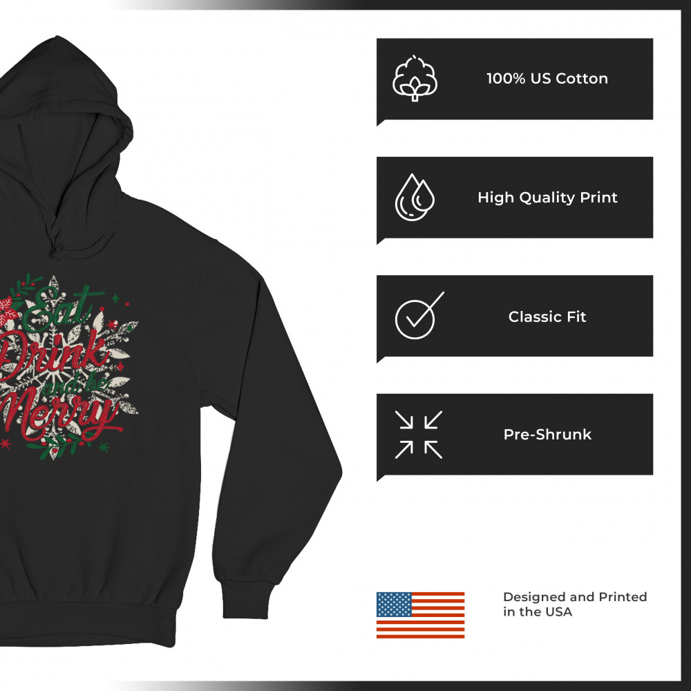 Bring the joy of the season with this "Eat, Drink, and Be Merry" design, crafted to make every holiday gathering a bit brighter. Ideal for cozy holiday mornings, family gatherings, Secret Santa gifts, or festive office parties, this piece captures the spirit of Christmas. Perfect for matching group sets or as a thoughtful holiday present, it’s designed in classic Christmas colors to complement the festive atmosphere. Let this design bring warmth and joy to your celebrations!