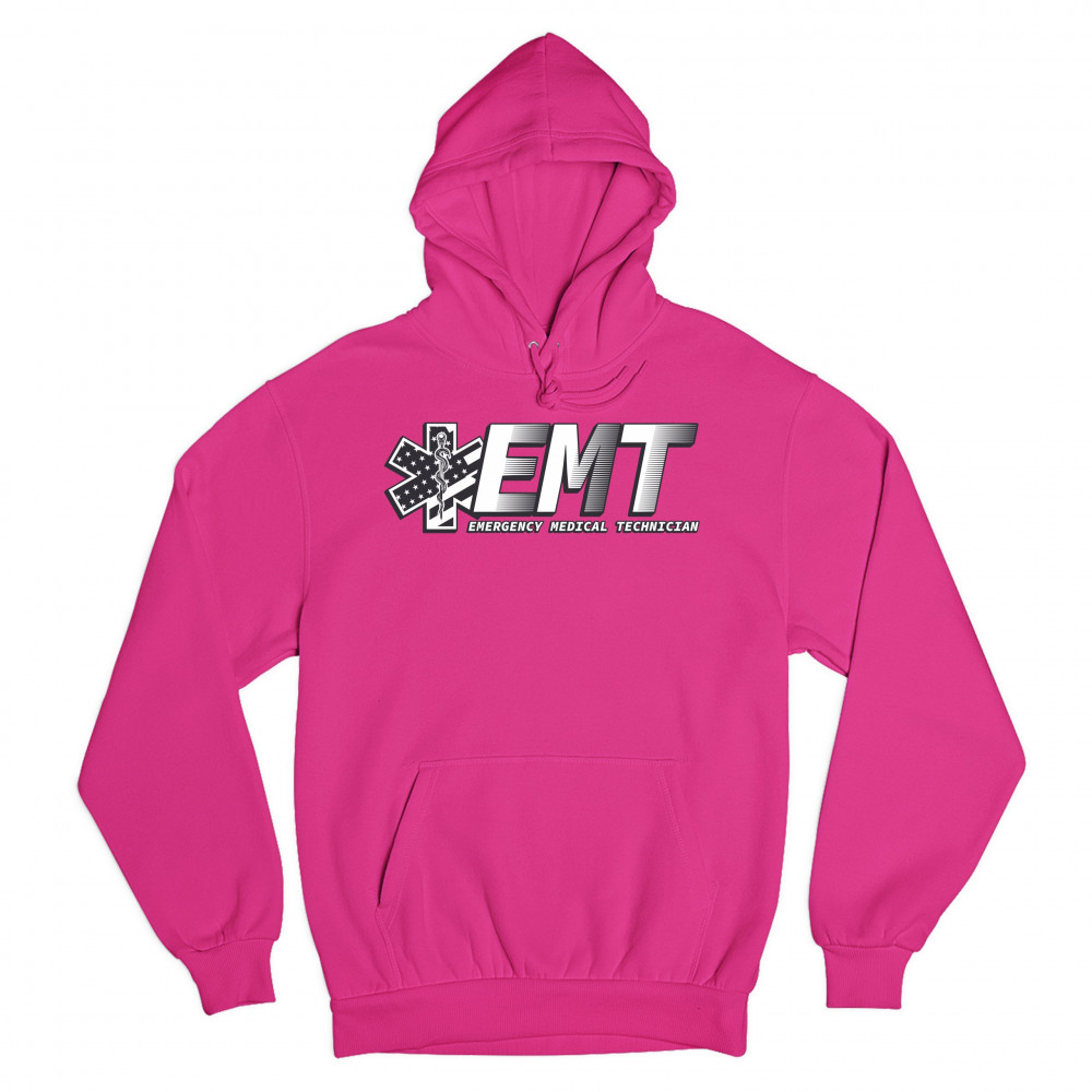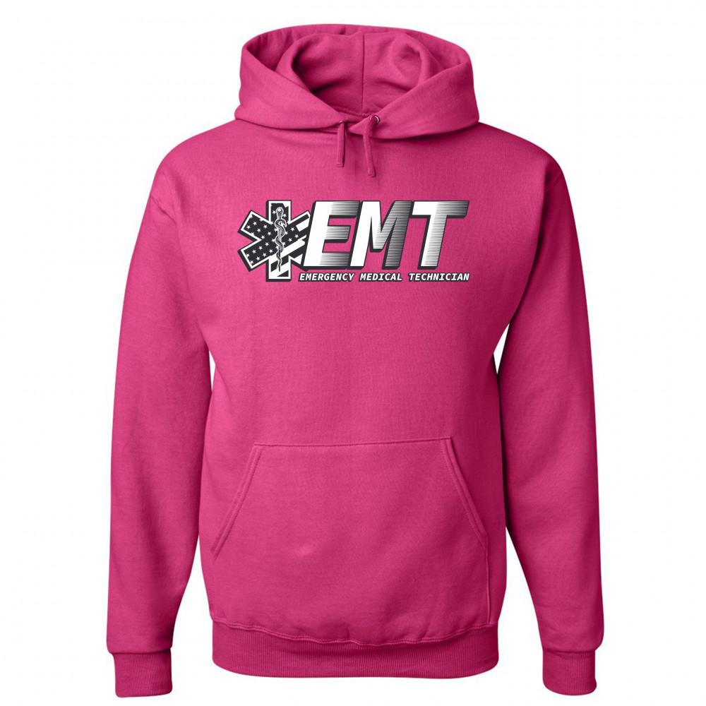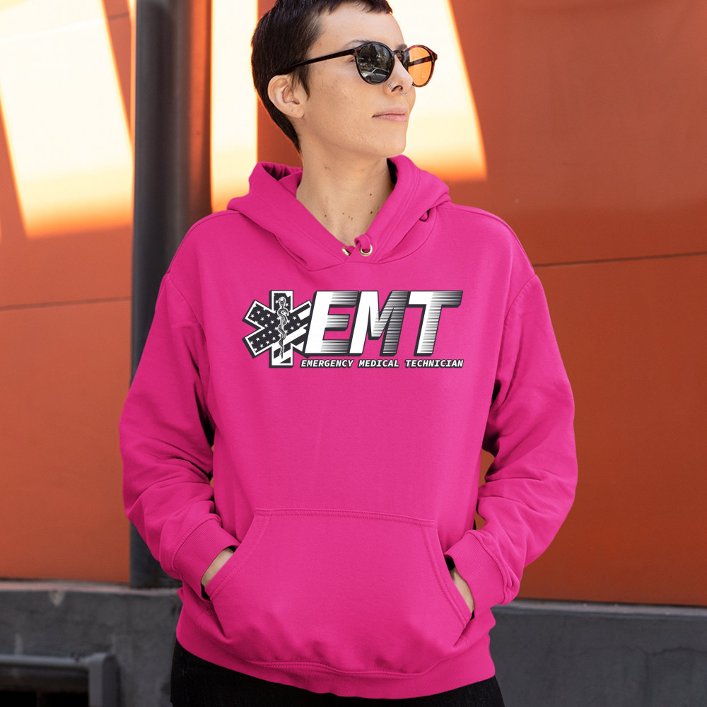 A print featuring big letters "EMT" - an abbreviation for "Emergency Medical Technician". On the left side the print features a Star of Life, the worldwide recognized symbol of emergency medical services, with the Rod of Asclepius and Stars and Stripes in