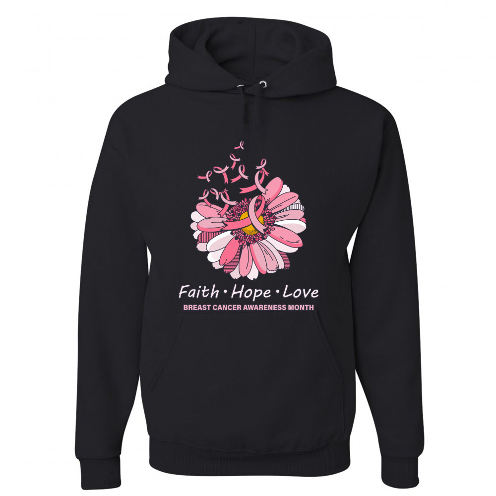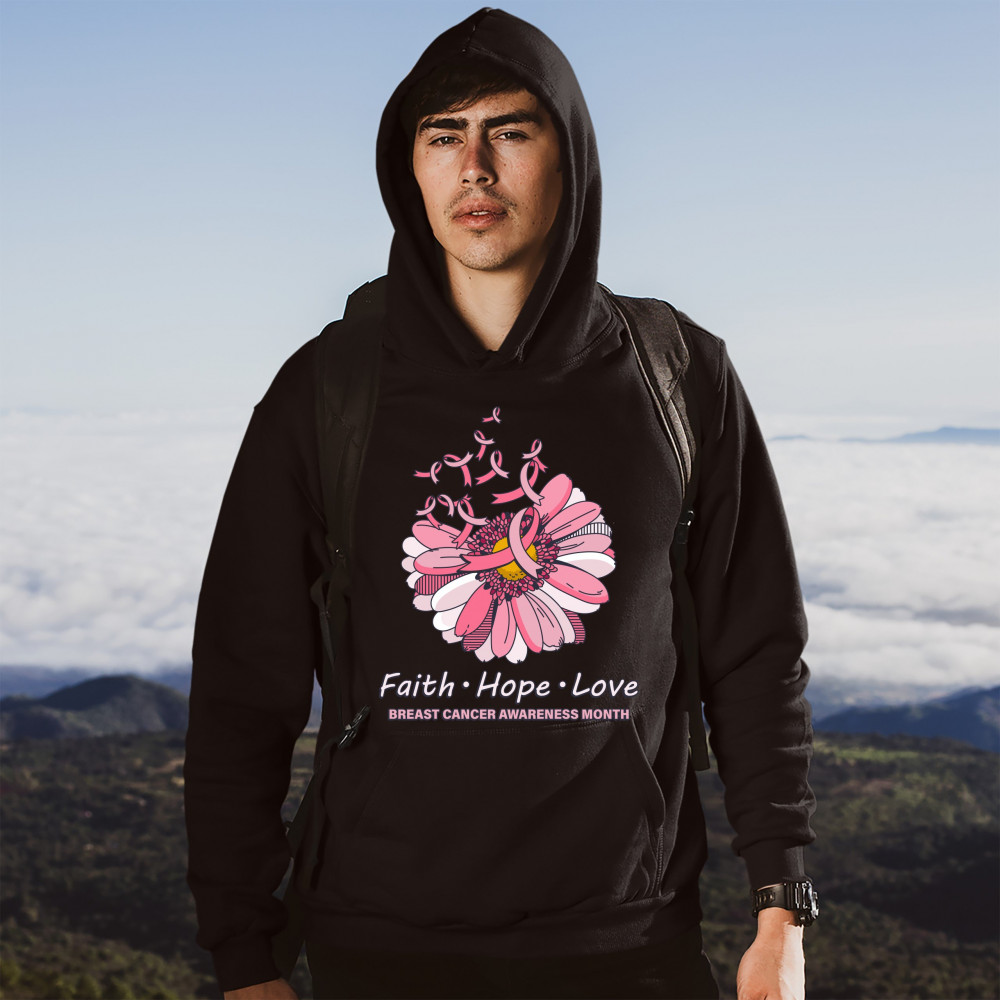 A print featuring a big flower with several petals missing and numerous pink ribbons flying away from it. The print says: "Faith Hope Love" and "Breast Cancer Awareness Month". Wear it to spread awareness abouth the disease and support a person you know w
