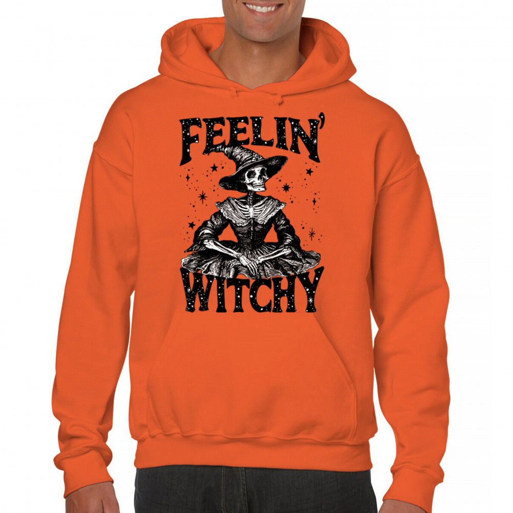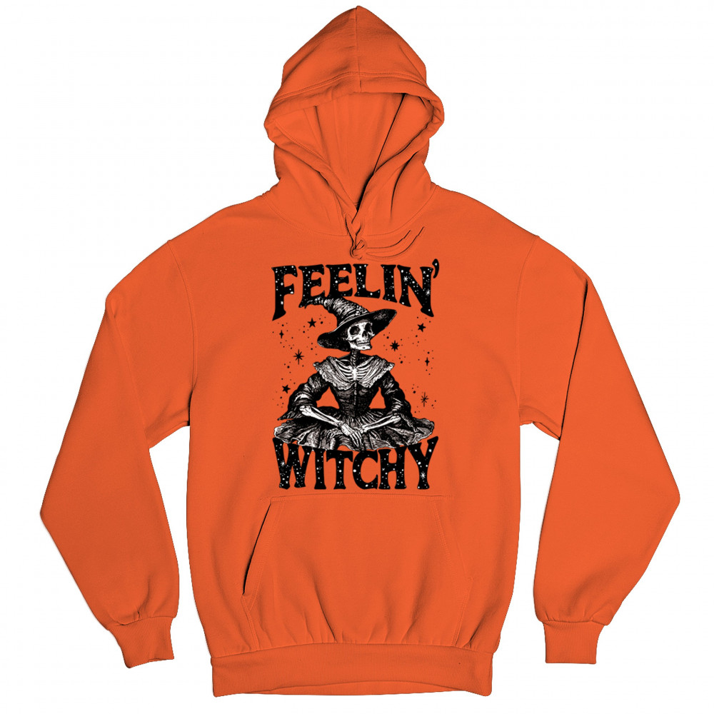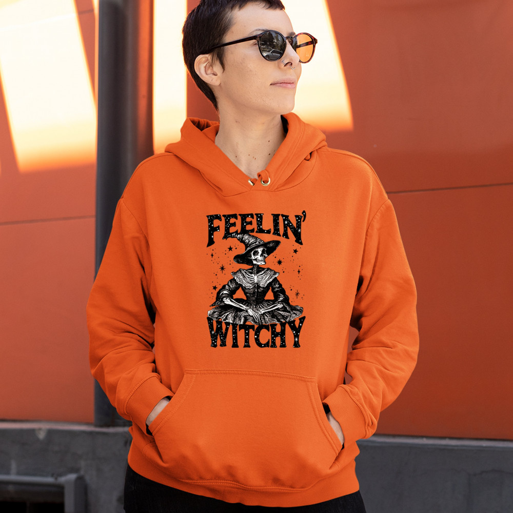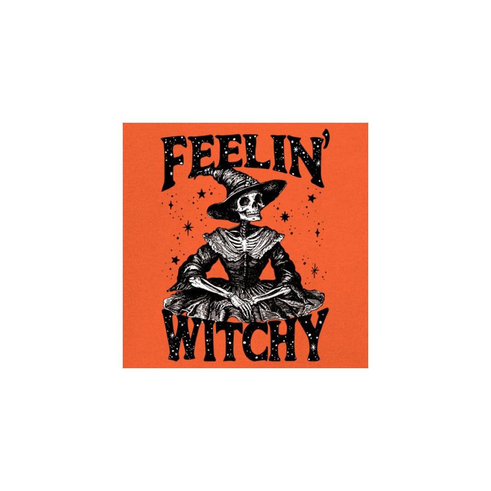 Add a touch of enchantment to your wardrobe with this "Feelin' Witchy" design. Perfect for Halloween, themed parties, or everyday wear, this piece captures gothic aesthetics with playful charm. Featuring a skeleton dressed as a witch, it celebrates the lighter side of spooky fashion. Ideal for those who enjoy blending whimsy with the supernatural, it's a must-have for the season.